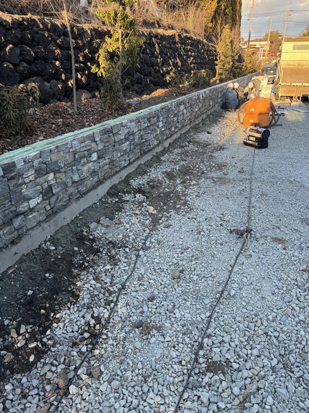 7時30分から17時、DHS様邸、石張り、目地、13m(7m2)、黒土1台搬入、タマリュウ植栽