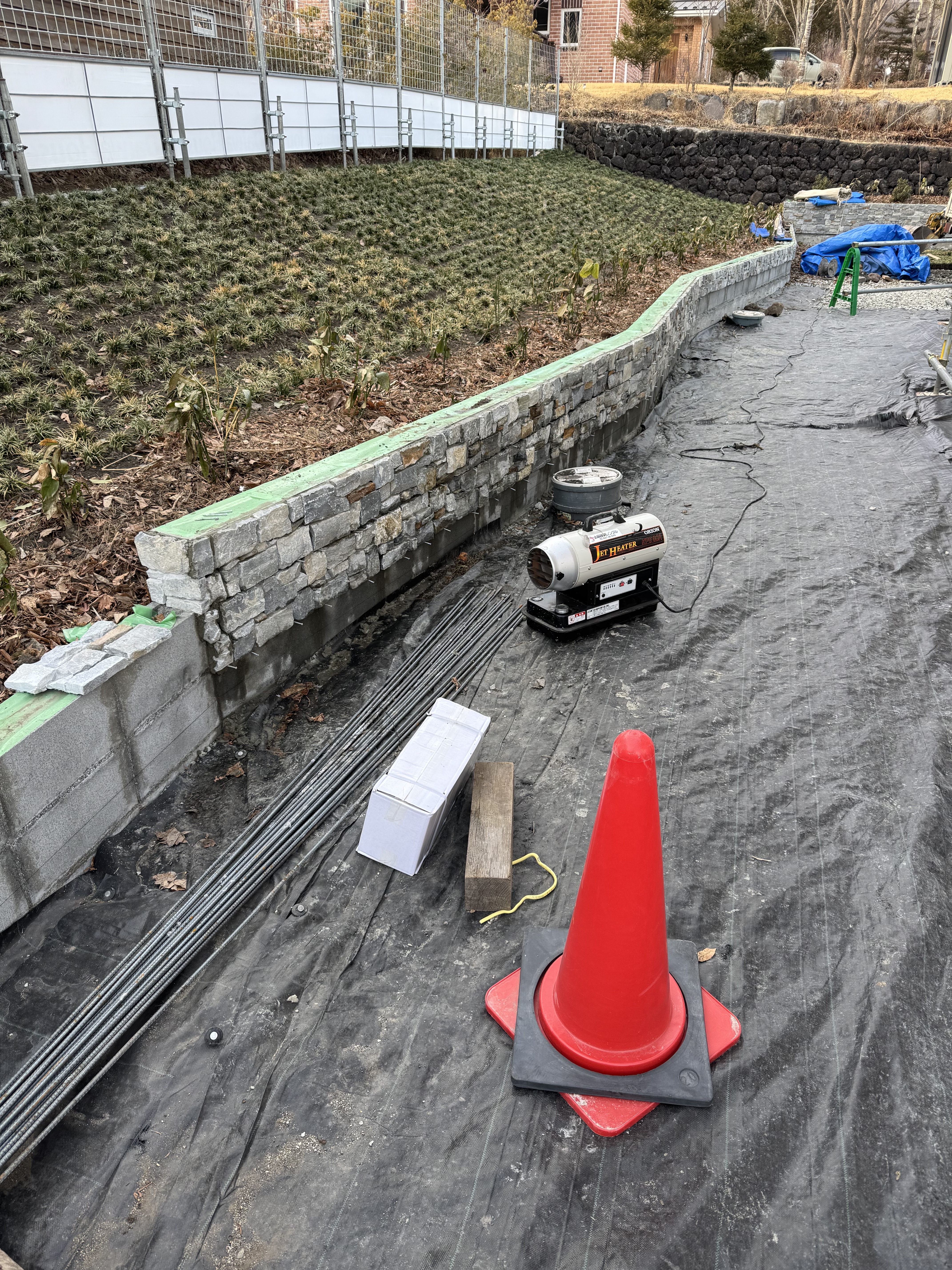 7時10分から17時、DHS様邸、石張り、北側約15m、西側、(1段11m、2段7m真物張り付け)、目地、人員6人