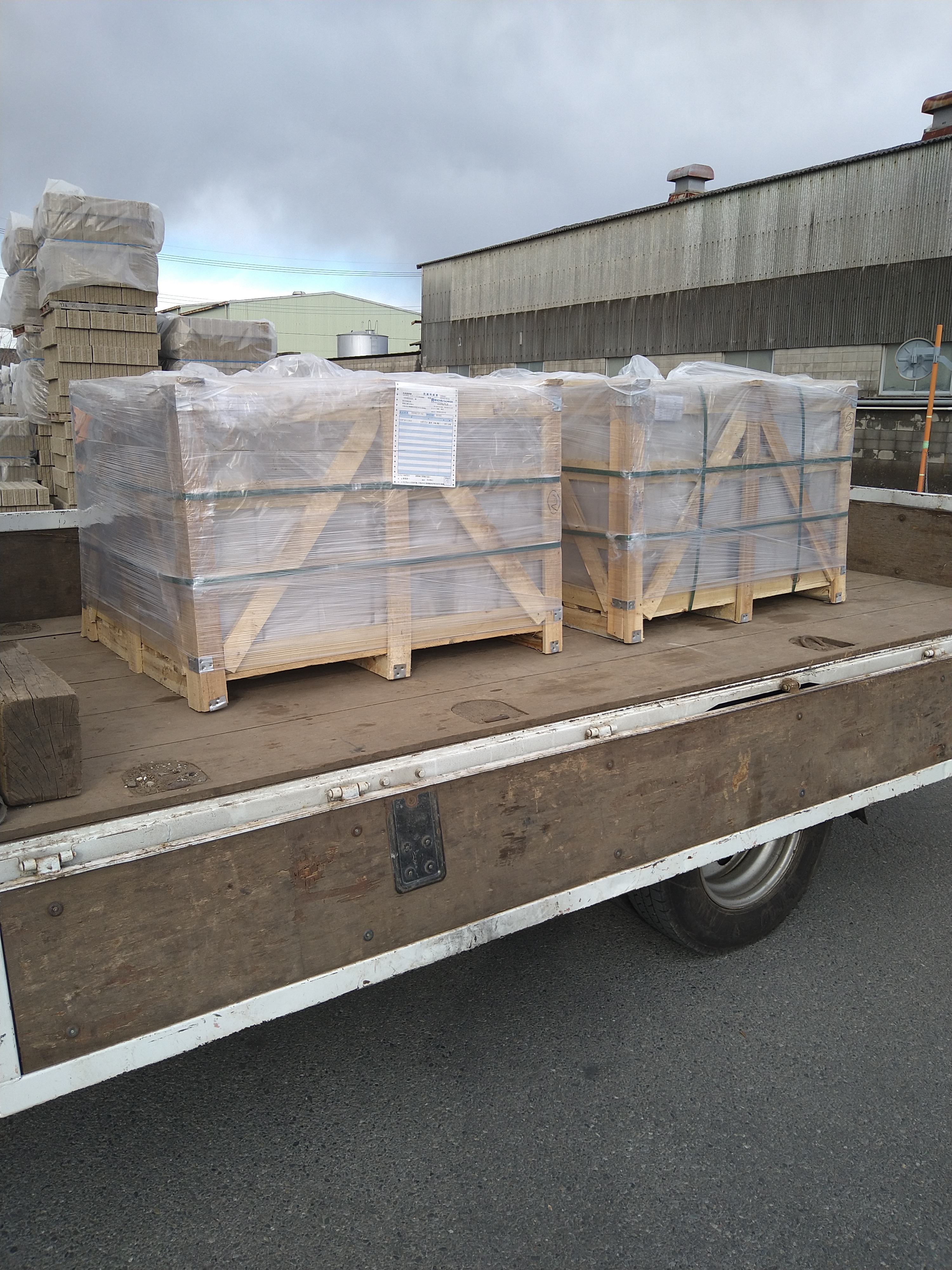 朝、伊勢崎市のブロック屋さんにブロック積みの上に付けるアルタスキャップを引き取りに行きました!2パレットと半端を手積みで荷台の空きスペースに積んで、11時過ぎに現場に到着し荷下ろしをしました!