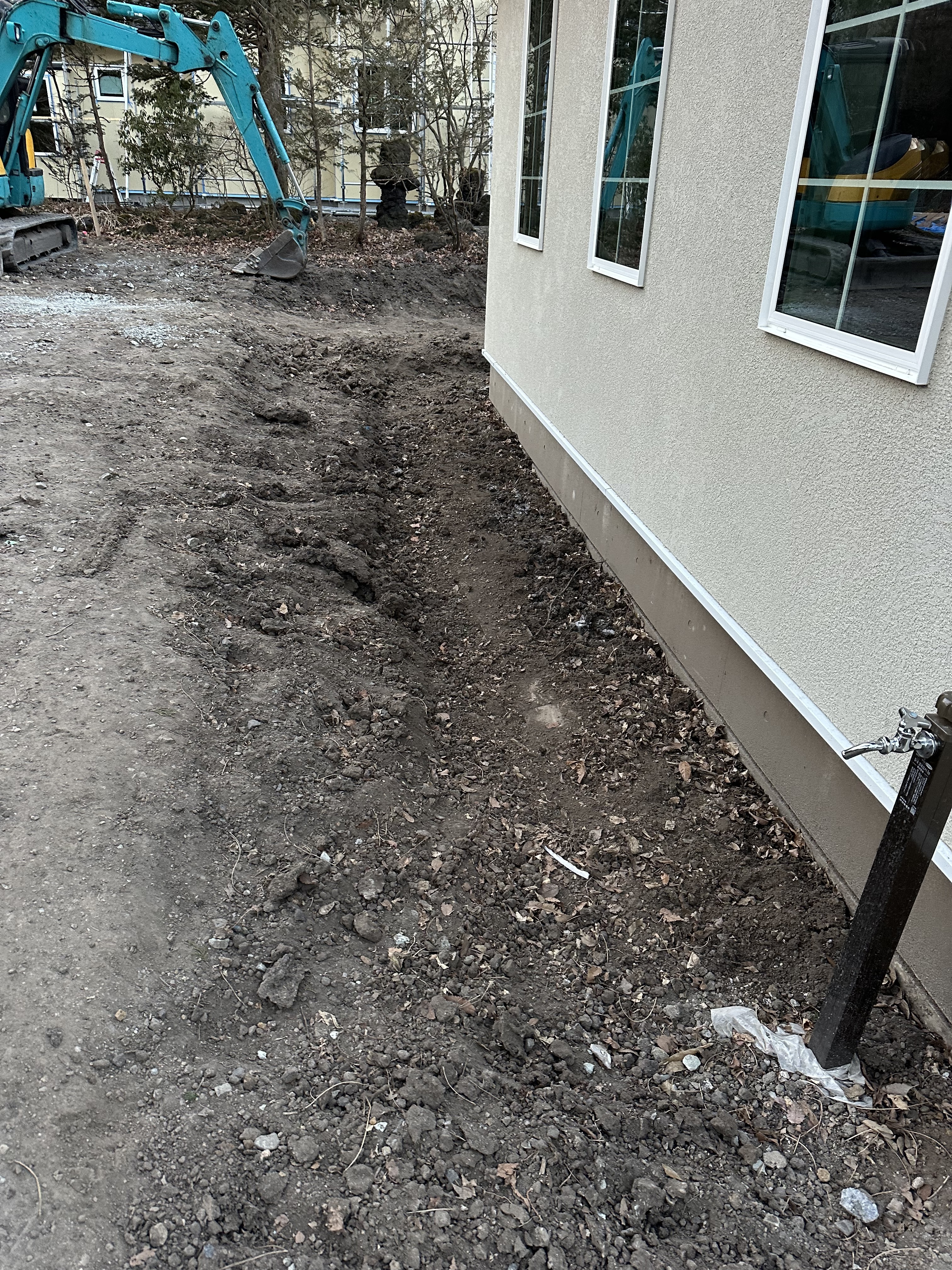 社長から仕事の指示をいただき ミニユンボで雨落ち掘削作業。