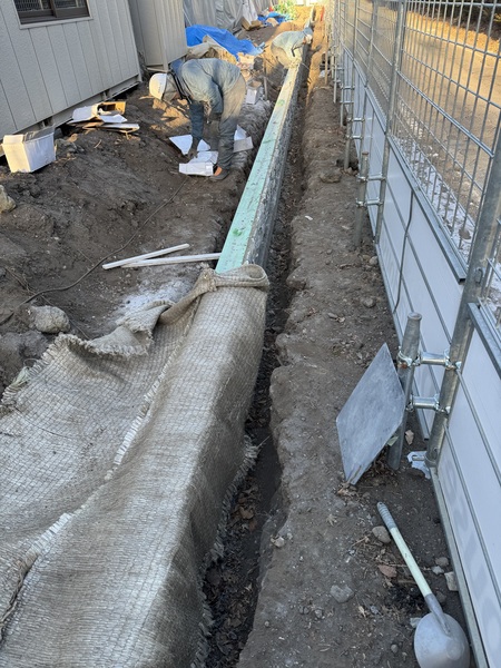 7時10分から16時45分、DHS様邸、西側と南側石張り、北側目地、西側の掘削、砕石入れ、段取り、人員6人、残土2台