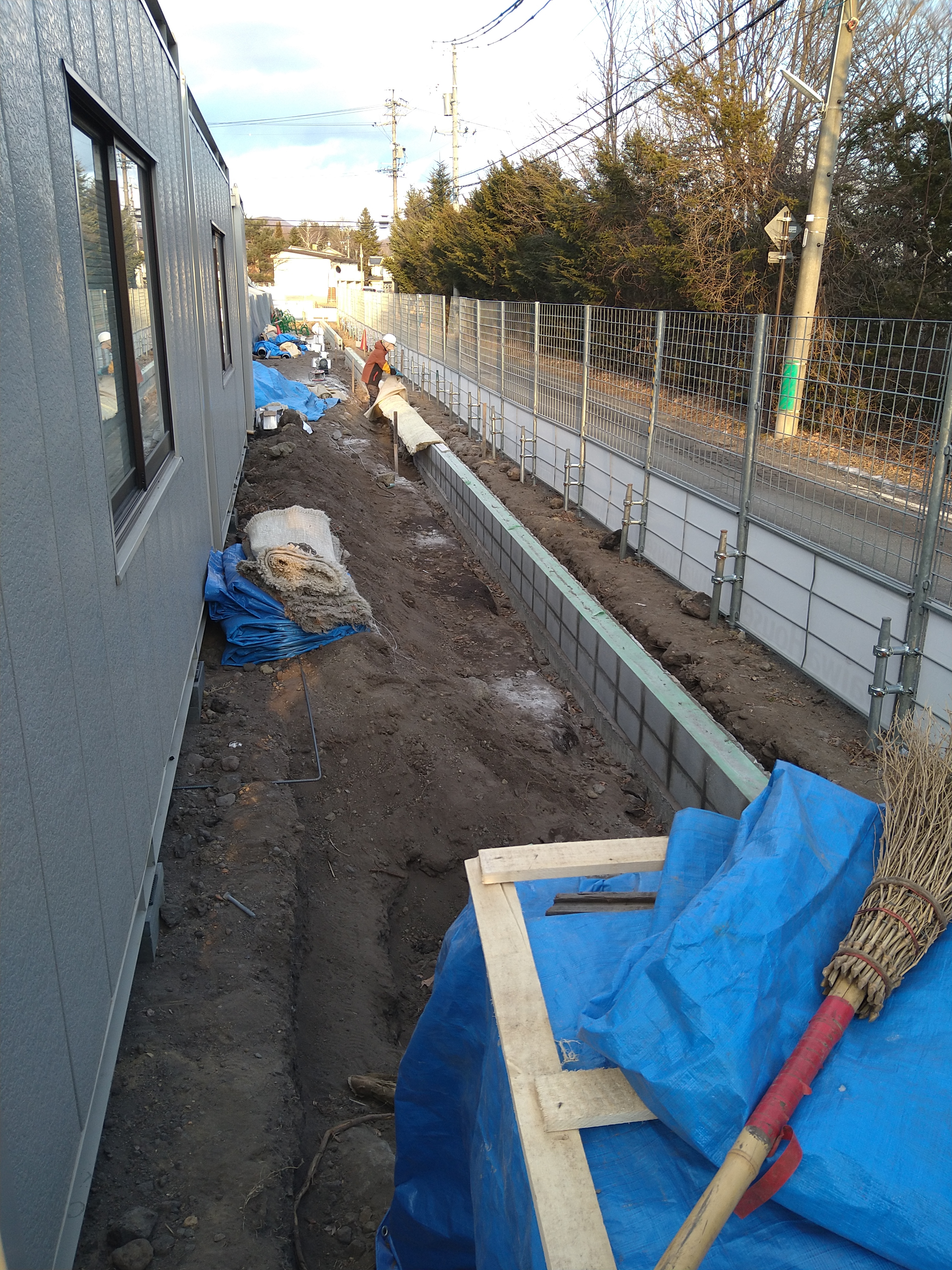 ローラー、養生シートを積んで現場に行き、8時から朝礼をし、手分け作業でした!3名で西側から南側にかけての仮囲いを一部移動してブロック基礎、置き換えの箇所の凍みをブレーカで割る段取りをしました!仮囲いの単管が凍みててなかなか抜けなかったです!