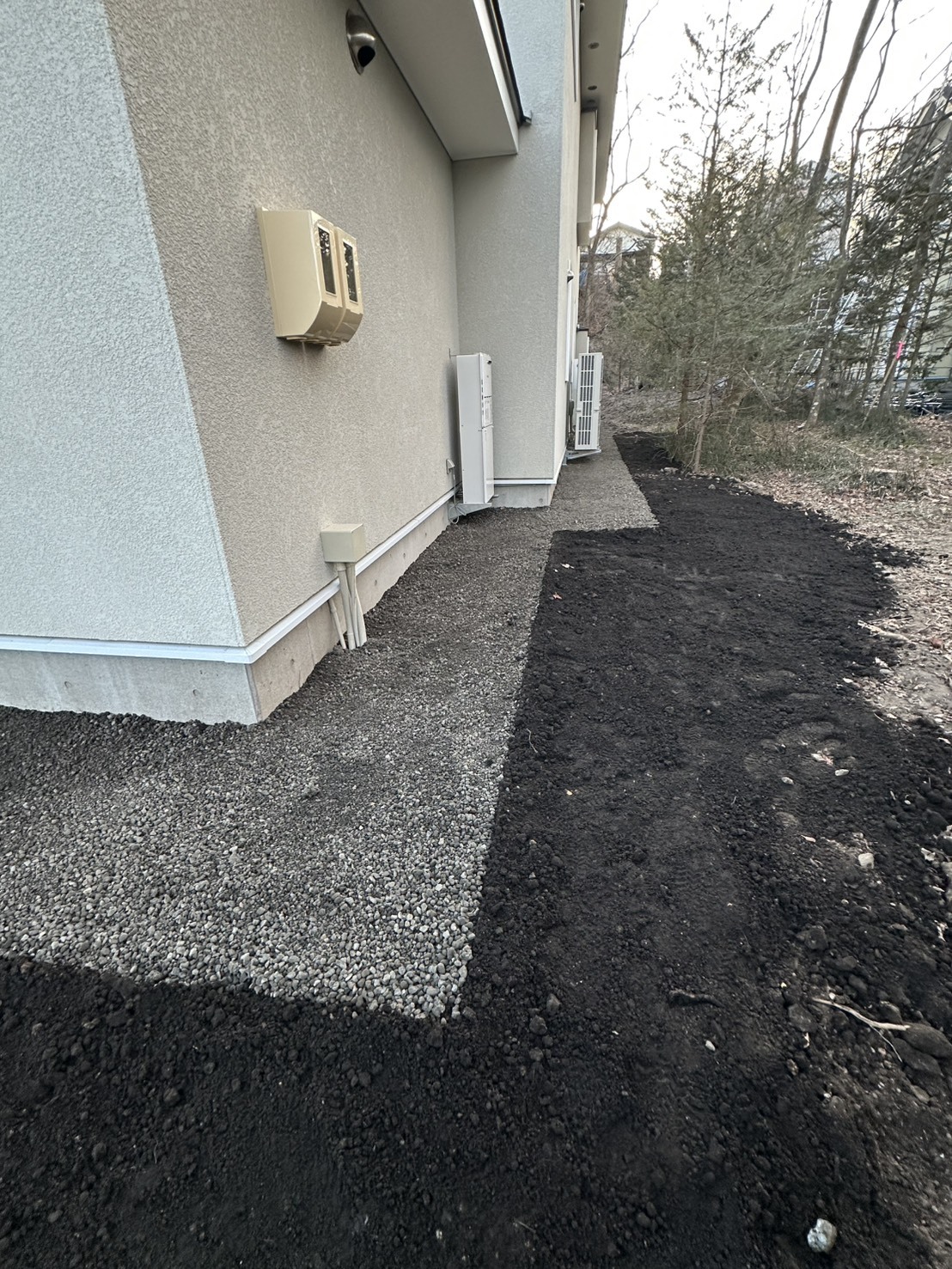 ABN様邸・KYO・雨落ち砂利入れ、黒土搬入、敷き均し