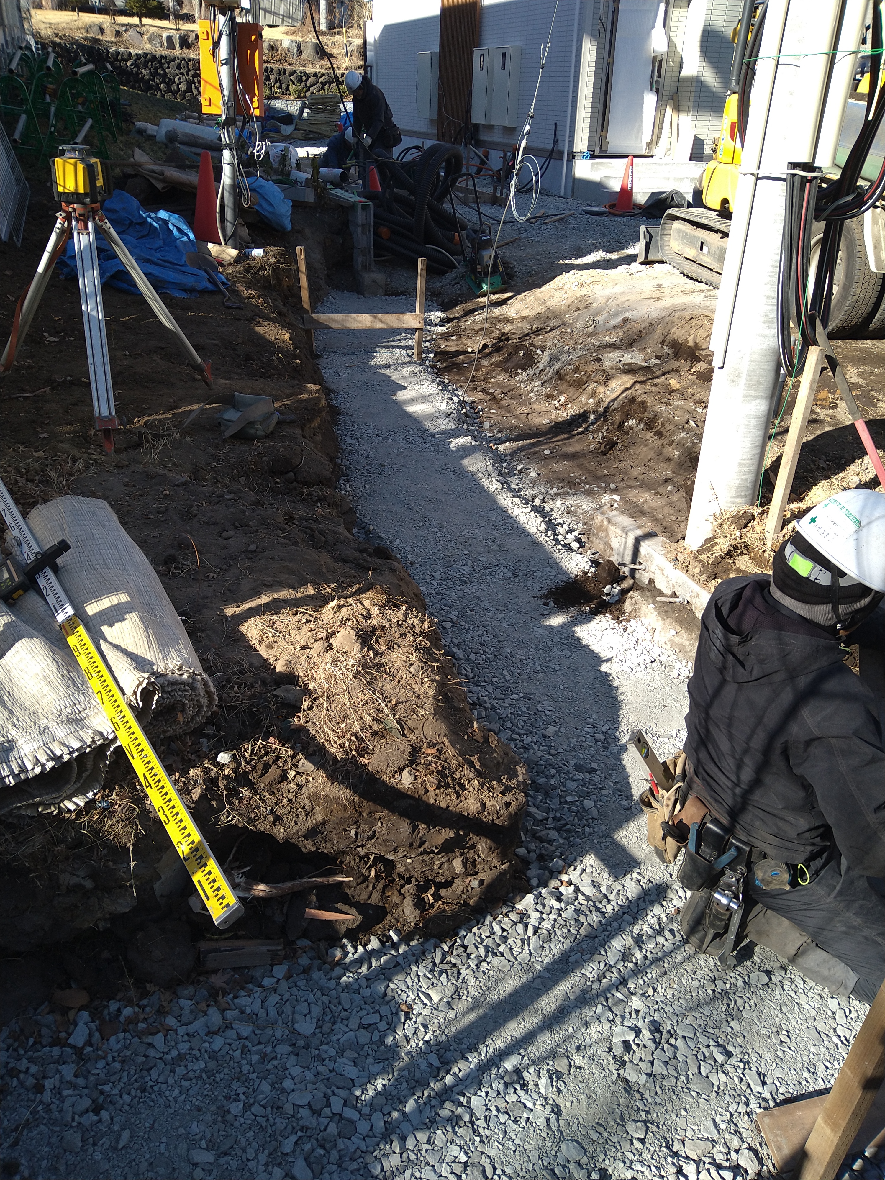 8時から朝礼をし、手分け作業で自分達は2~3名で南側から西側のブロック基礎の掘削、昨日割った凍みこごりの積み込み搬出をやりました!途中、割り足りない箇所が出てきたので、ブレーカを北側から回送して割りました!砕石を敷均し転圧し、ブロック基礎の丁張りをかけ、型枠の段取りを始めました!ユンボ、ブレーカ、ハンマードリル、ダンプ、レーザー使用しました!人員5名、5時終了しました!