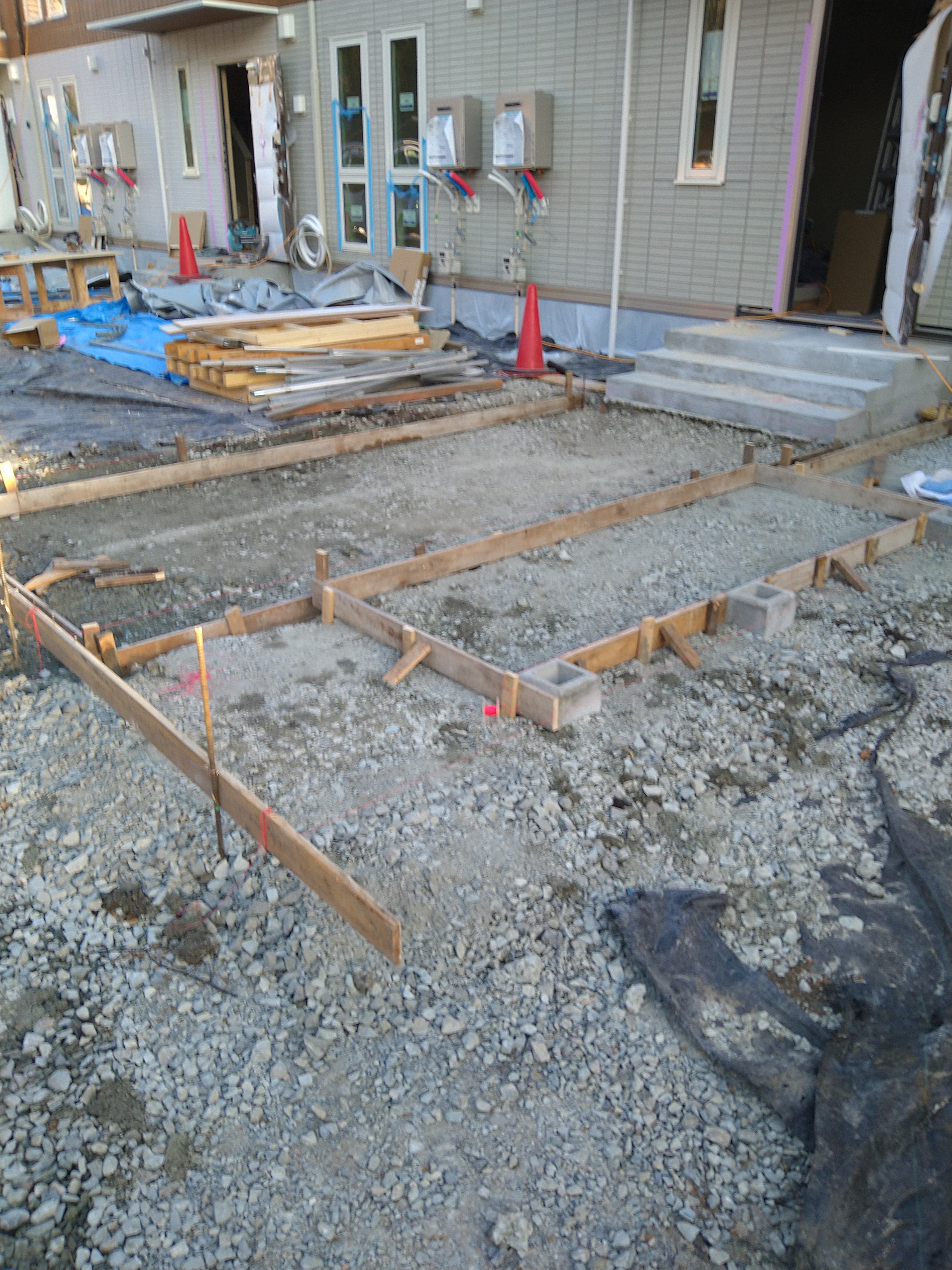 シート剥ぎをし朝礼終了後に手分けで作業しました!3名で北側の物置小屋、駐輪場、玄関アプローチの基礎砕石床掘りをしました!ガチガチに凍みているので、とりあえず位置をマーキングし、ブレーカでなるべく細かく割り、南側からユンボを持って来て凍みこごりをバケットで横に出し、ジェットヒーターで温めてハンマードリルで細かくしました!荒仕上げをしローラー、プレートで転圧し、仕上げをしました!午後から温かくなったので、凍みこごりもかなり気にならなくなりました!物置小屋、駐輪場、玄関アプローチに型枠を組み始めました!ダンプ、ユンボ、ブレーカ、ハンマードリル、ジェットヒーター、レーザー、ローラー、プレート使用しました!人員5名、5時終了しました!