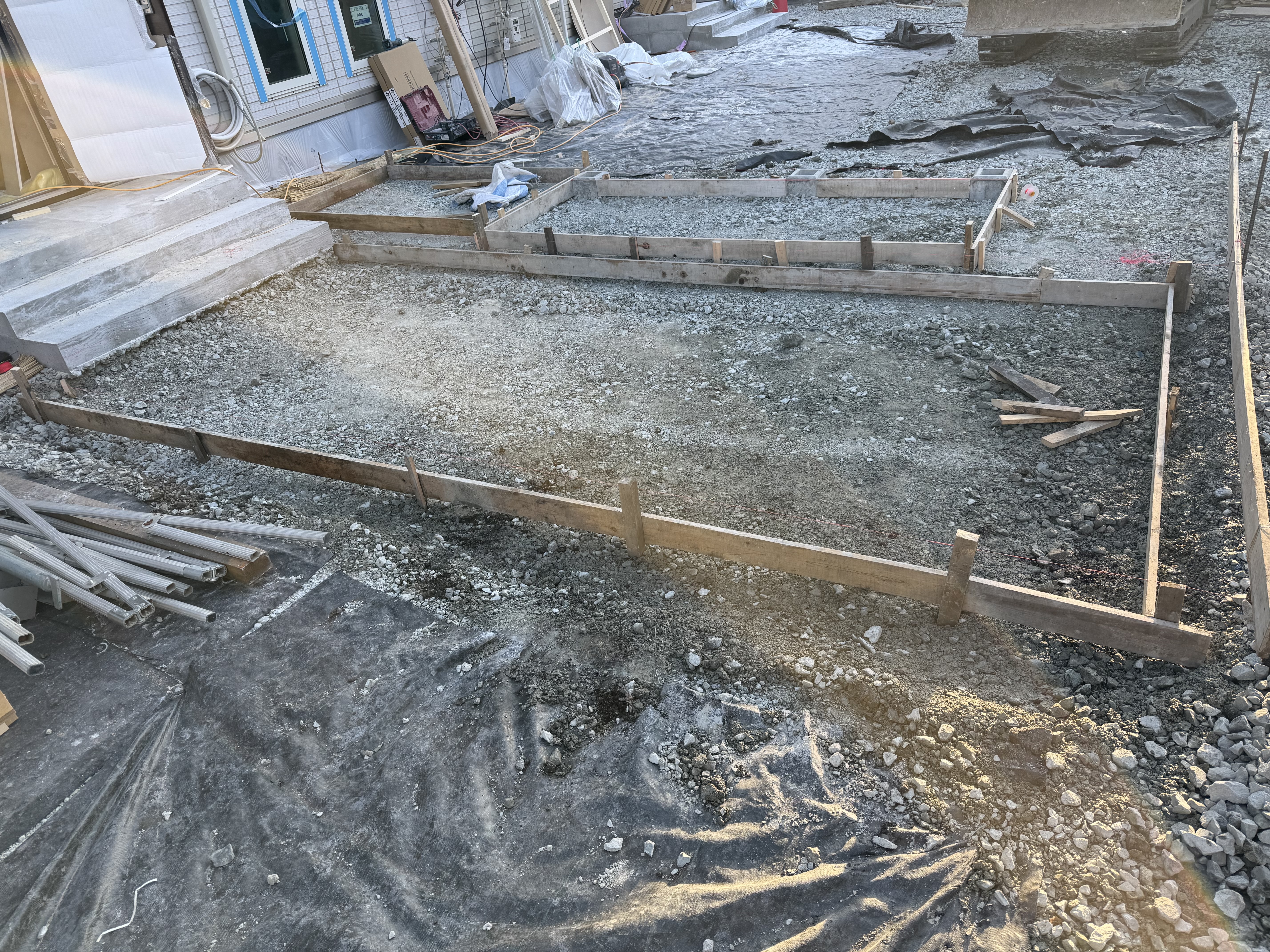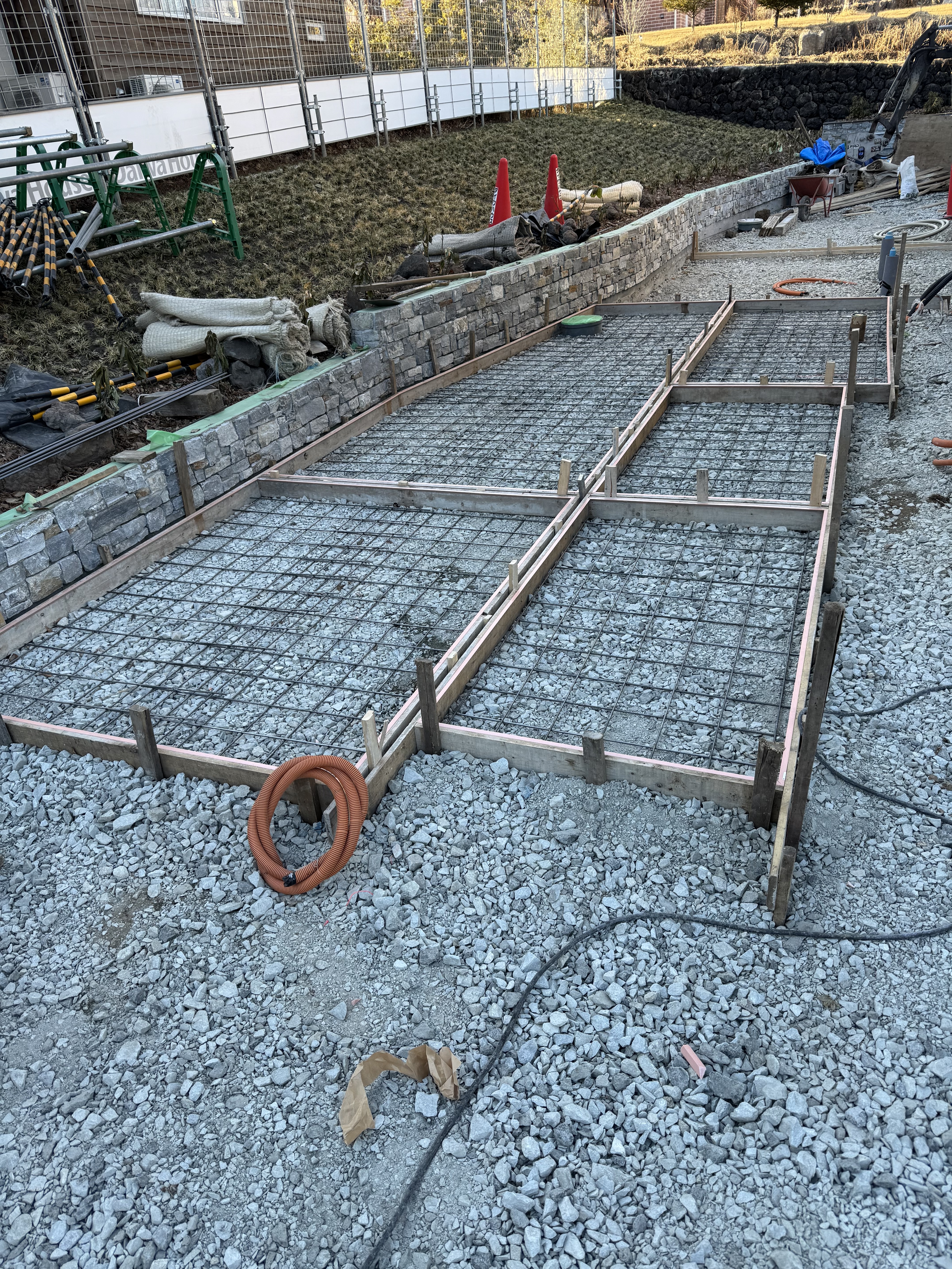 7時10分から17時.DHS様邸、石張り、ガス置き場、ゴミ置き場のメッシュ敷き、面木打ち、玄関前のアプローチ、物置、駐輪場の掘削、砕石敷き、型枠組み立て、束石3個設置