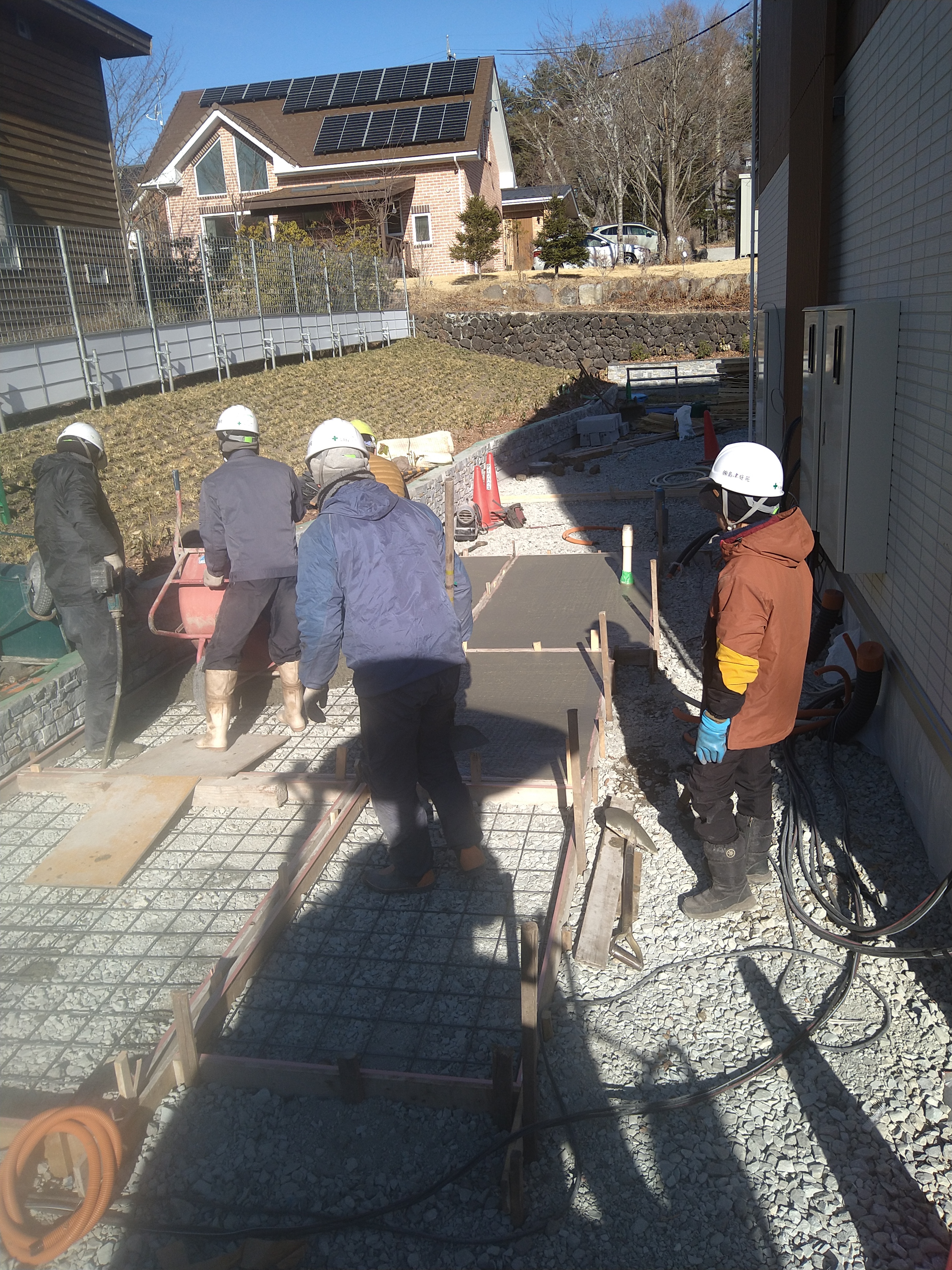 打設後、仕上げは左官屋さんに任せて、それぞれの作業にあたりました!自分は2人で北側の続きで、砕石路盤に玄関アプローチ、物置小屋、駐輪場の位置をマーキングしてもらい、ブレーカで凍みを割りました!丁張りをかけてもらい、床掘り、プレート転圧し、砕石を足して仕上げをしました!明朝、ローラー仕上げをします!