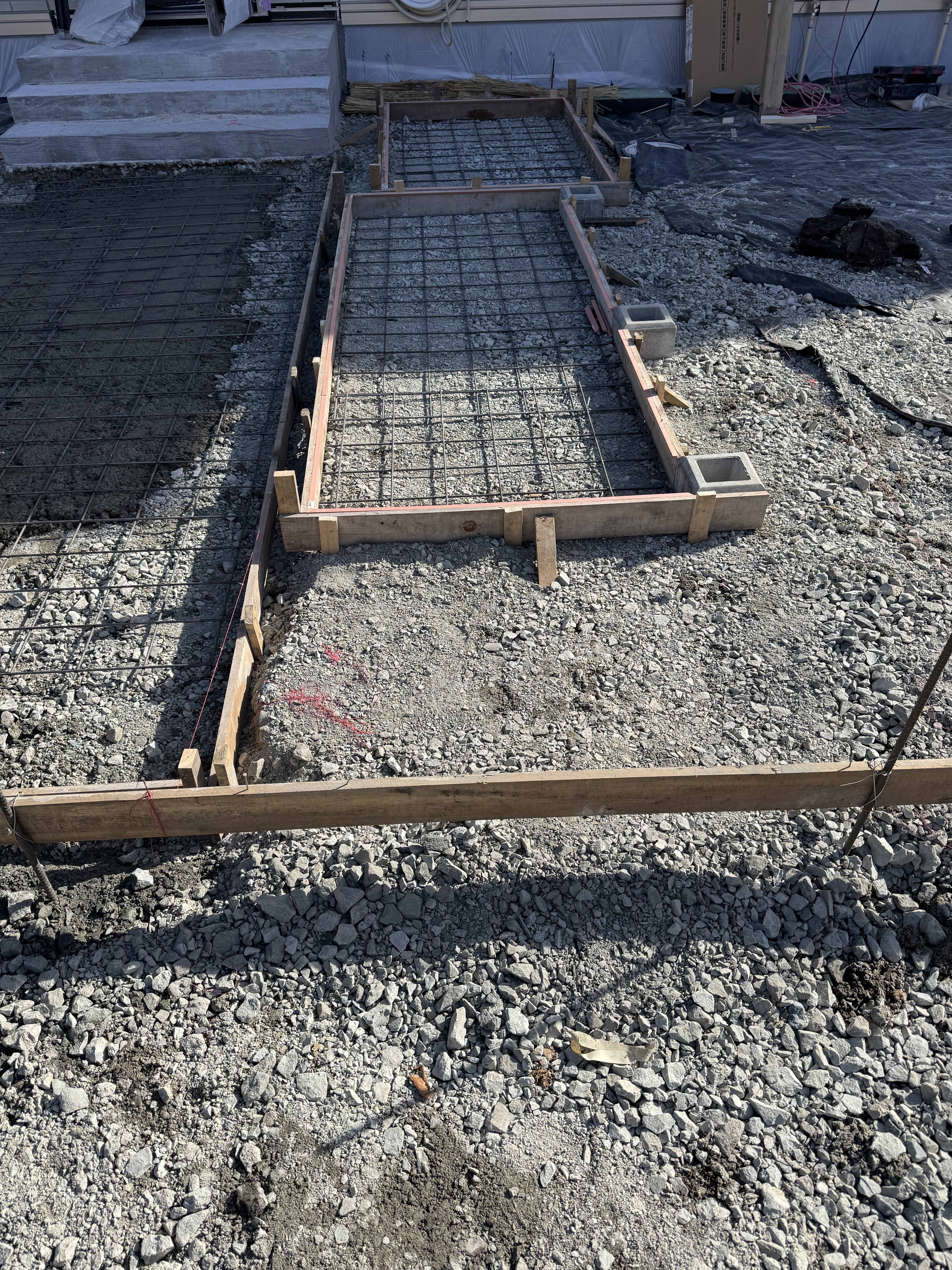 玄関前アプローチの掘削、砕石敷き、転圧、型枠組み立て2箇所