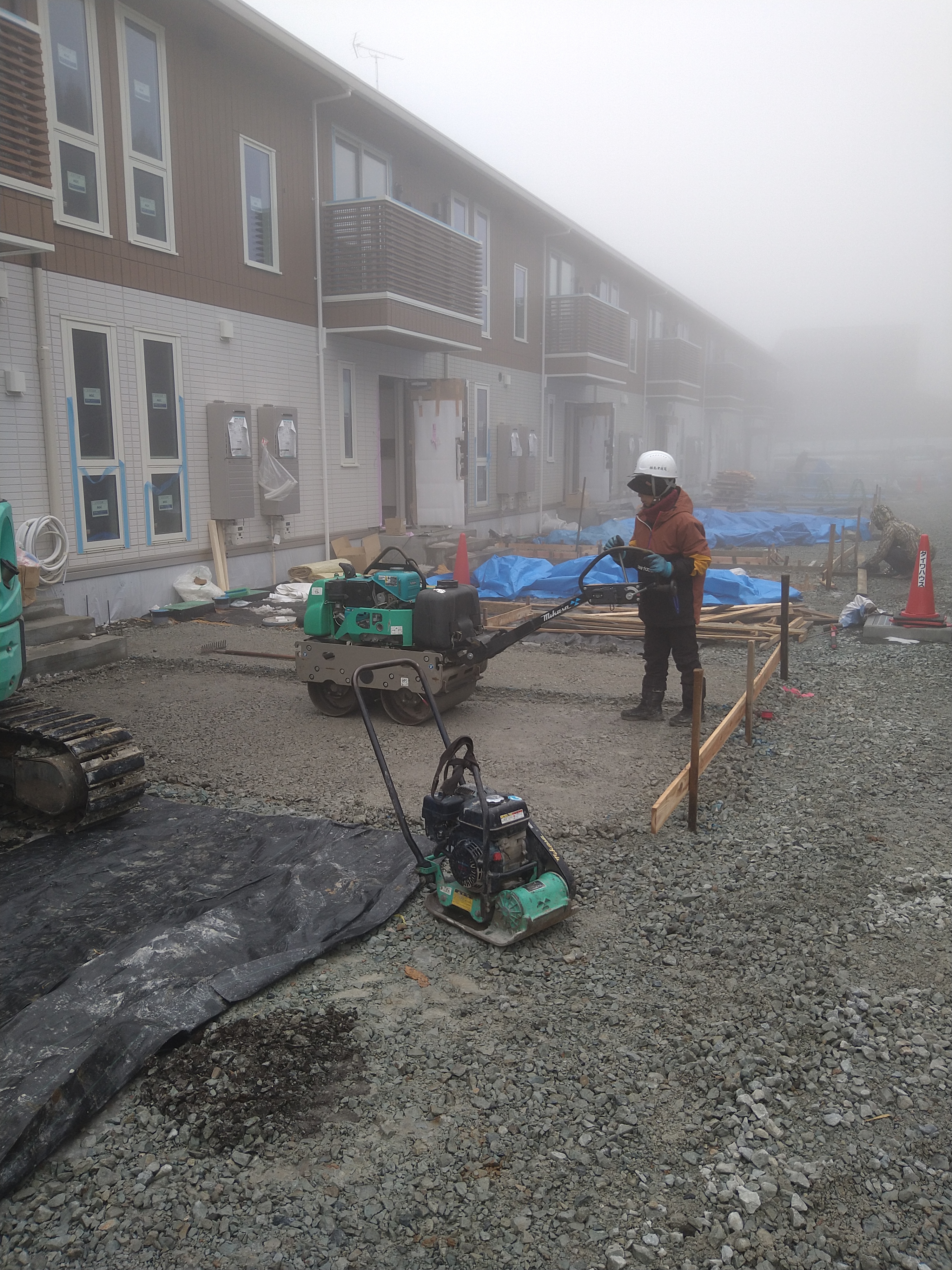 今日の場所は水たまりが凍った部分が有ったので、そこを先に割って氷混じりの凍みこごりを日当たり良いトコに先に出しました!その後残りの部分を割り、凍みこごりを取り除き転圧し、丁張り掛けをして仕上げをし転圧しました!4時過ぎから玄関アプローチの型枠が完了してるトコにワイヤメッシュを布設しました!