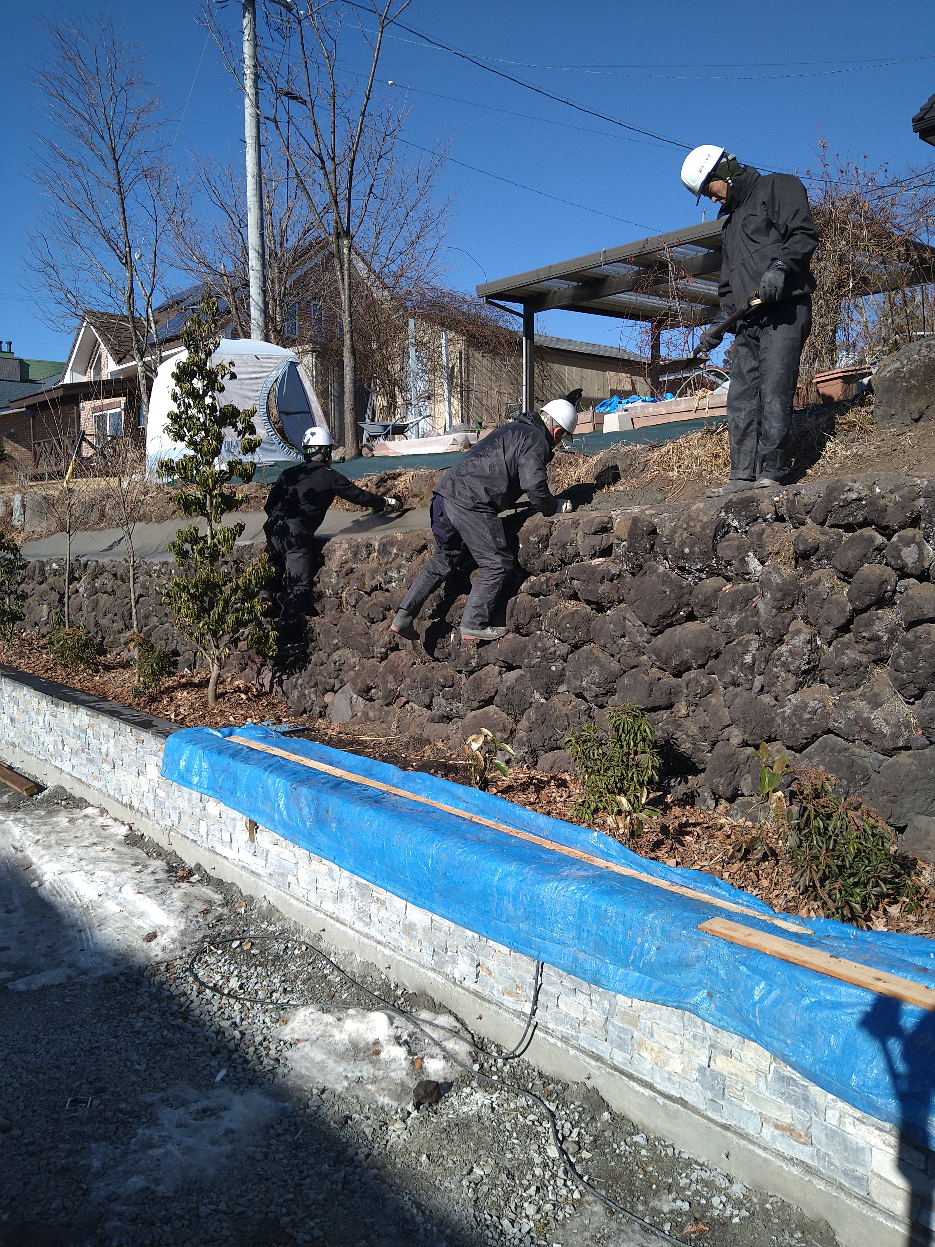 北側7軒目の駐輪場、玄関アプローチの位置出しをし、午後から2名で凍みをブレーカで割りました!階段前にパイプが布設してあるのでそこはハンマードリルで慎重に凍みを割りました!玄関アプローチの仕上げ転圧をしました!