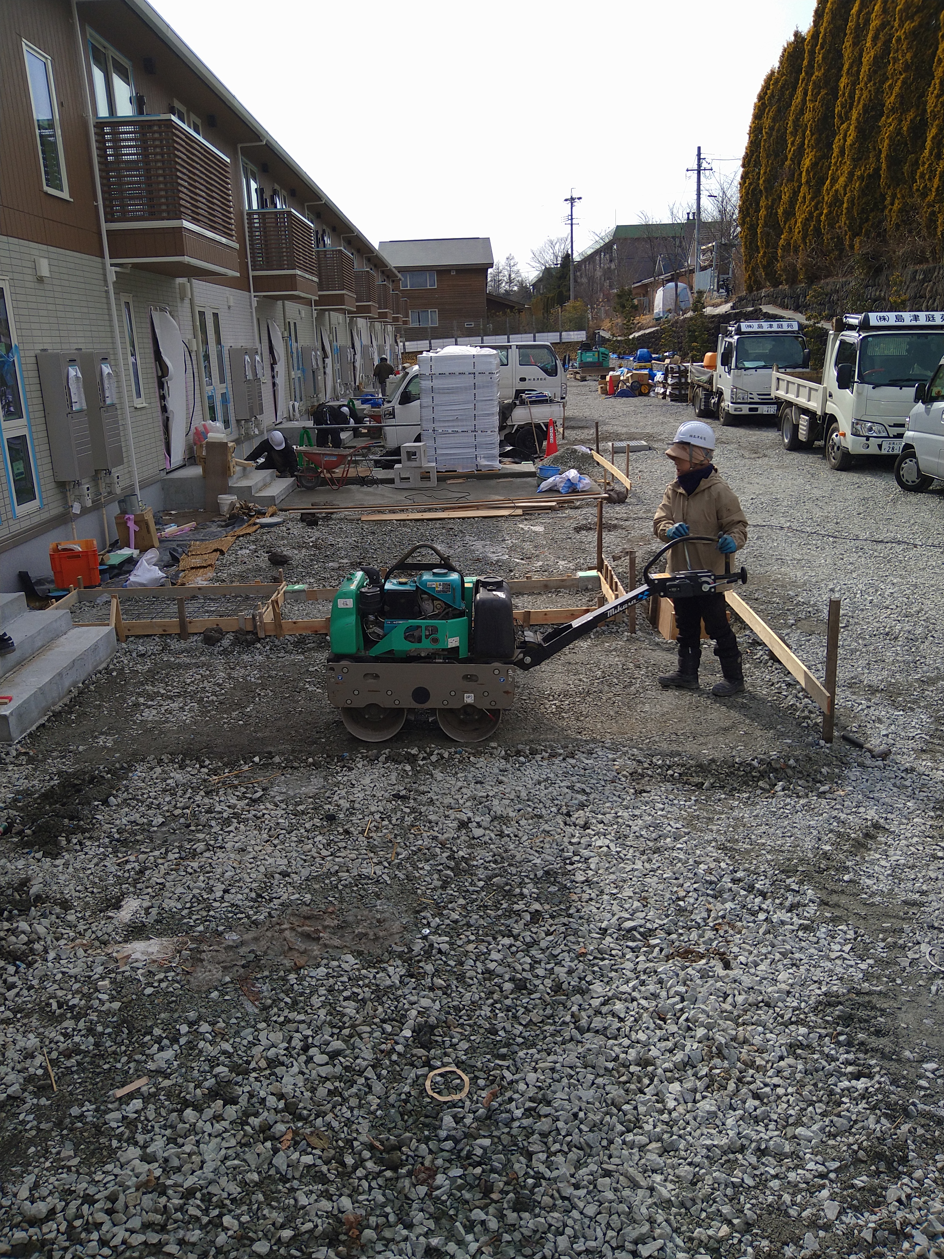 朝礼後に、今日は10名体制なので、手分け作業で2人でポスト部の凍み割りをし、北側8軒目の玄関アプローチ、物置小屋部分の防草シート剥ぎをし、7軒目の駐輪場の砕石仕上げ、転圧してから戻って8軒目の凍み割りをし、高さと通りを出して粗仕上げ後に転圧仕上げをしました!途中、合間に束石パレットを南側に移動して、2時過ぎに南側の現場事務所横のブロック手前に砕石を埋戻し、転圧しました!