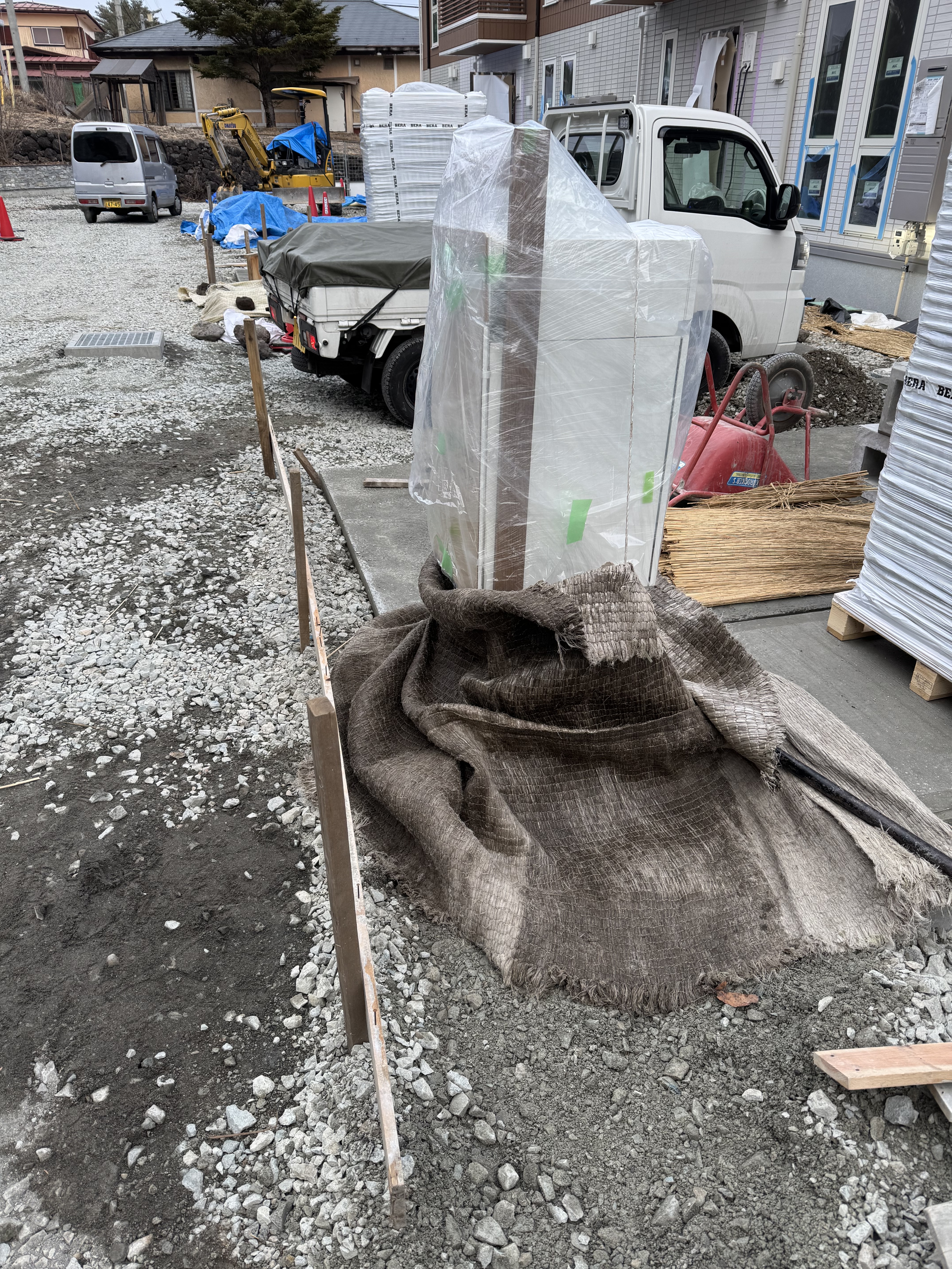 7時10分から17時、DHS様邸、脱型、アプローチ、物置、自転車置き場、車止め、多機能ポストの掘削、砕石敷き、型枠組み立て、束布設