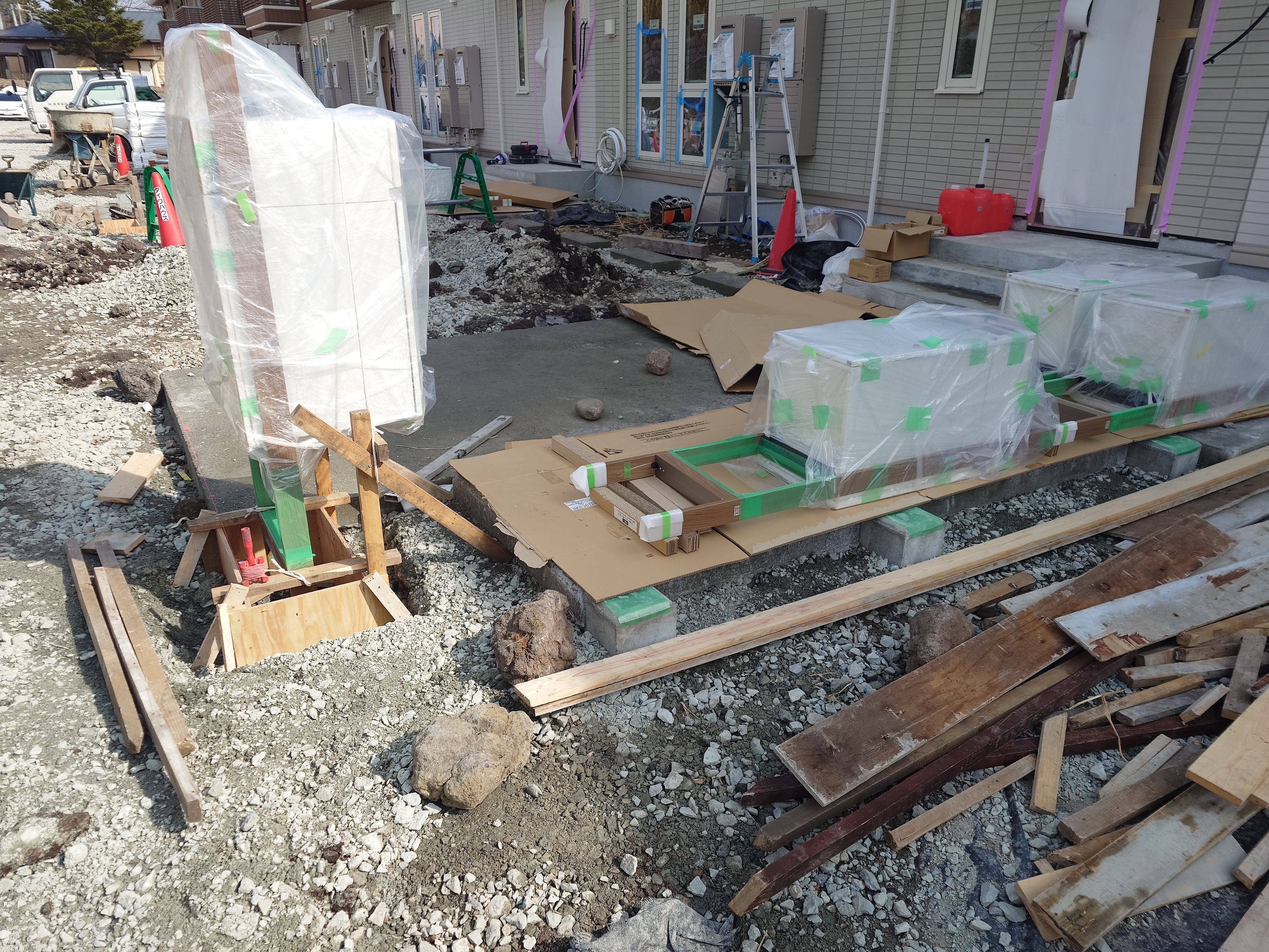 8時20分からDHS様邸・門柱型枠設置、門柱セット5組やる。