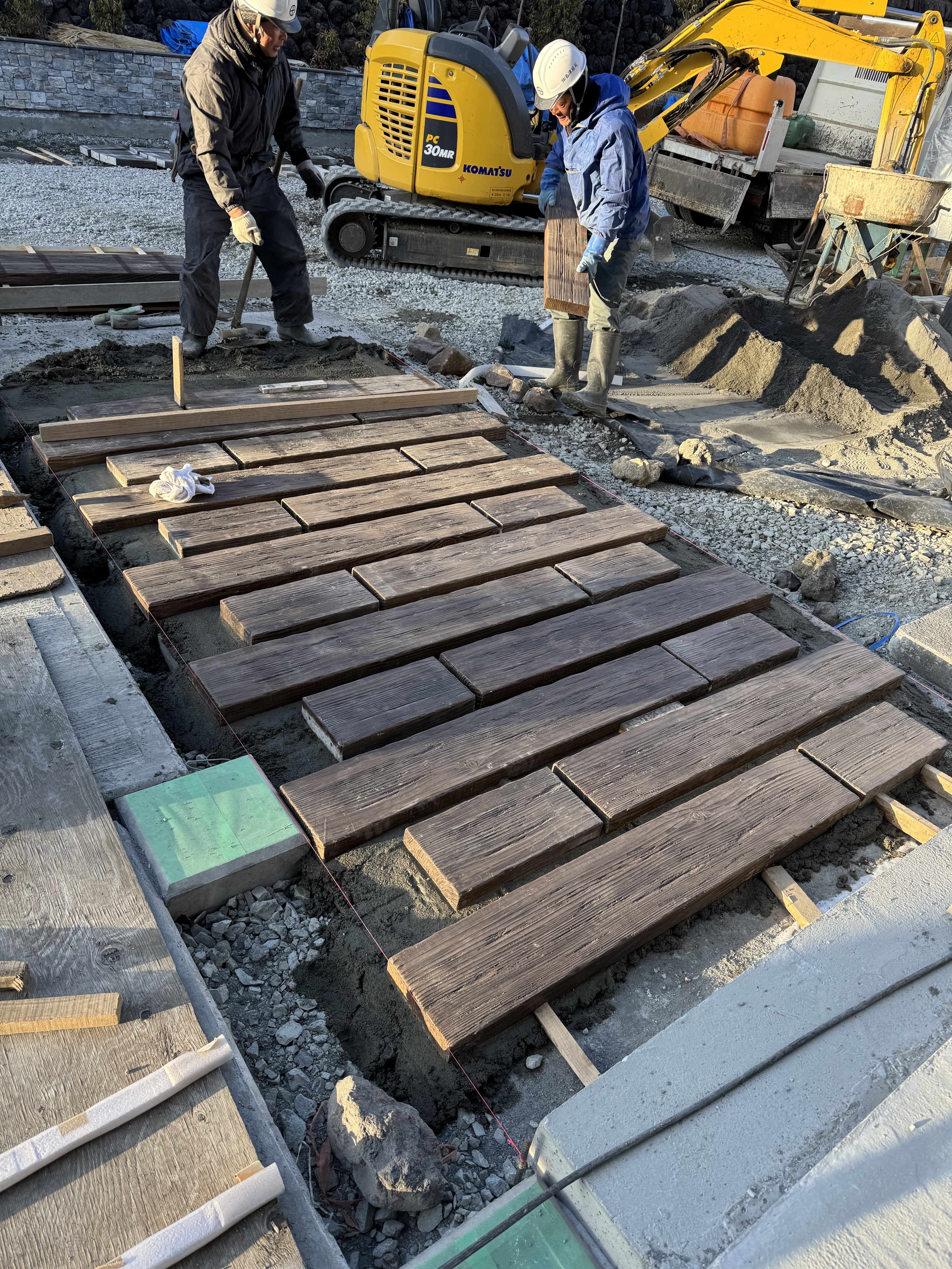 7時10分から17時20分、DHS様邸、石張り、目地、擬木枕木加工、布設、オーニング基礎、自転車置き場、物置の型枠組み立て、束布設