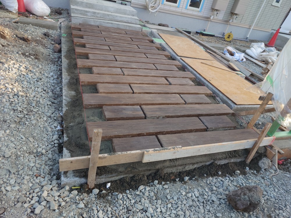 モルタルを敷きながら擬木枕木を敷いていく。
