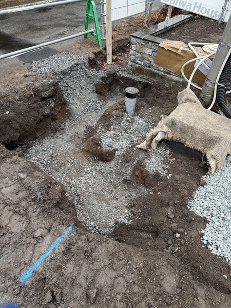 7時10分から17時、DHS様邸、ブロック基礎の掘削、砕石敷き約9m、フェンス束、大6個、中9個布設、自転車置き場、物置、アプローチ3ヶ所床付け、脱型、掃除、擬木枕木運搬
