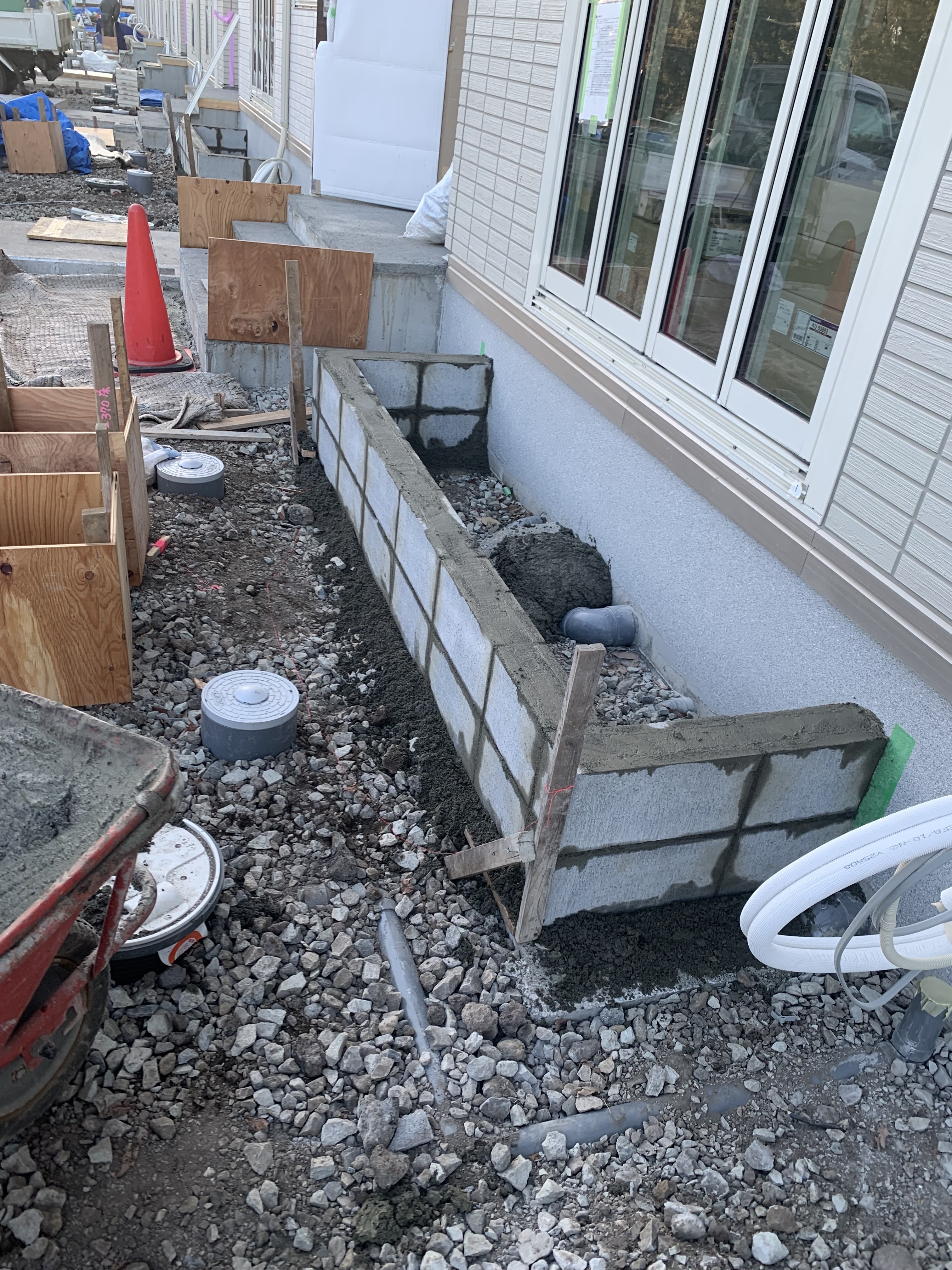 シートはぎ、オーニングブロック積み丁張り出し、鉄筋組み、ブロック加工、ブロック積み(4箇所)、モルタル詰め、目地、養生