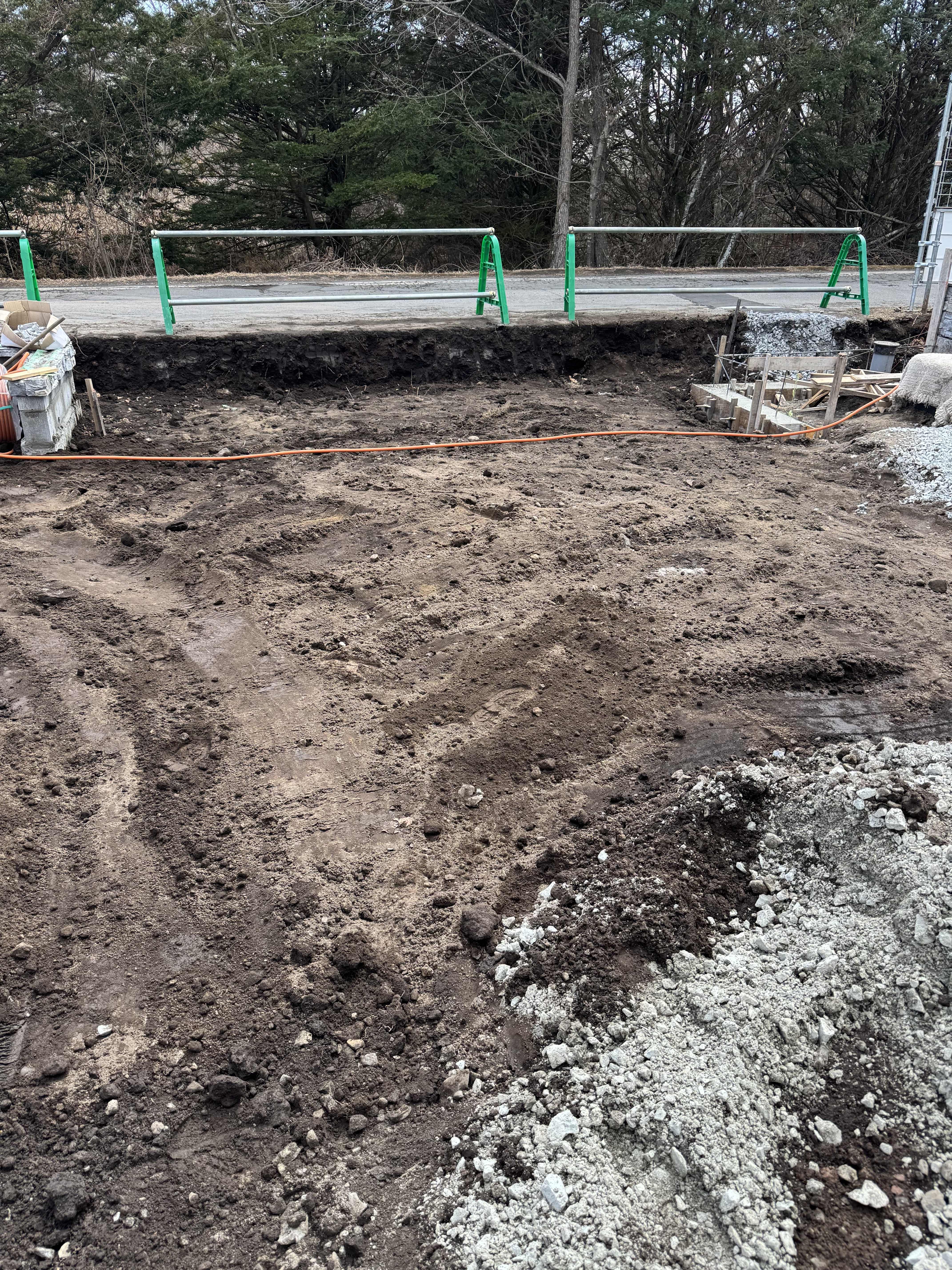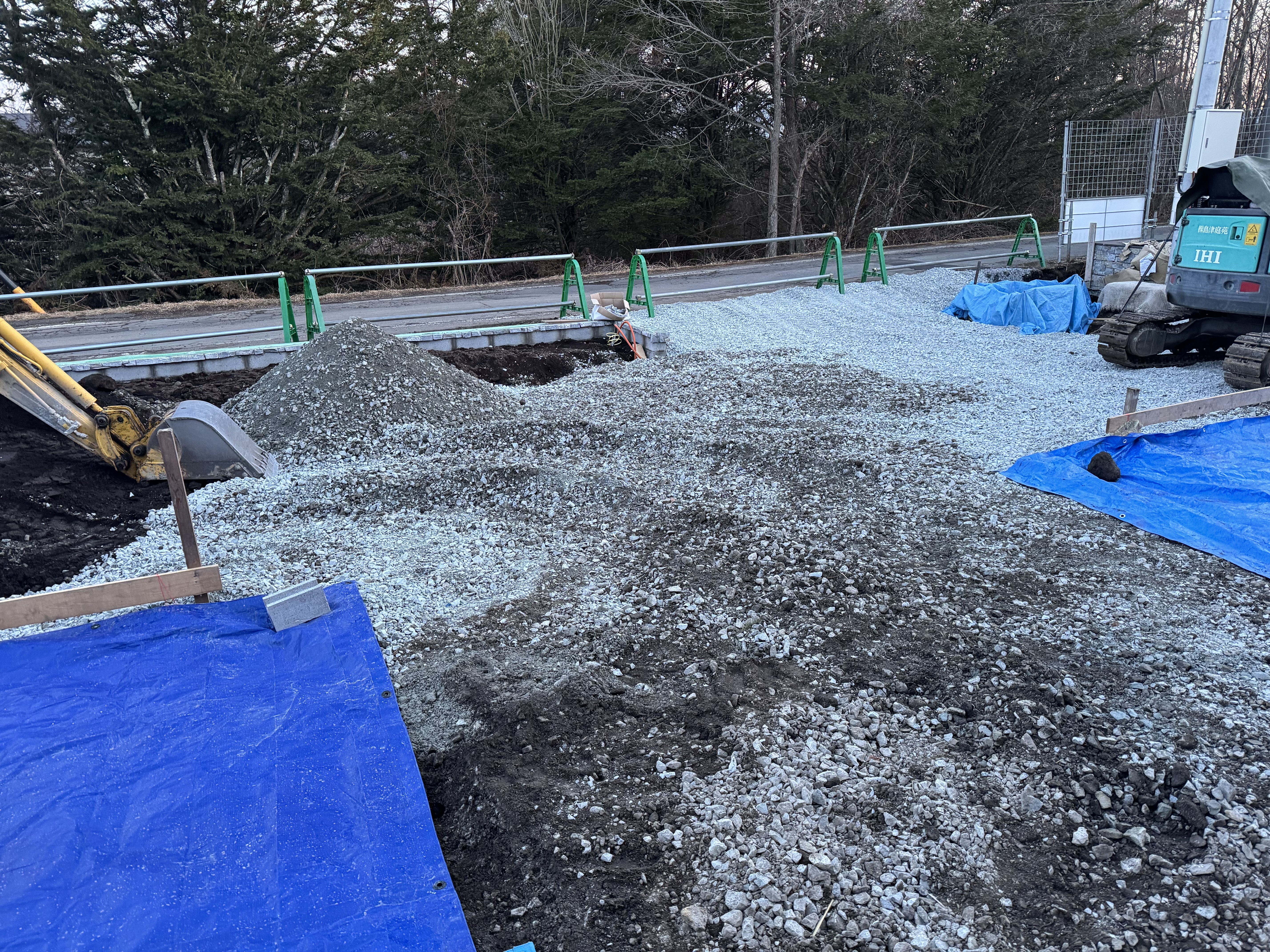 7時10分から18時、DHS様邸、南側入り口付近、掘削、砕石敷き残土12台、砕石大型2台、自転車置き場、物置の床付け、型枠組み1ヶ所、オーニング基礎のブロック積み、4ヶ所、北側、砕石敷き大型5台、グラベルフィックス敷き、ビリ敷き、大型1台