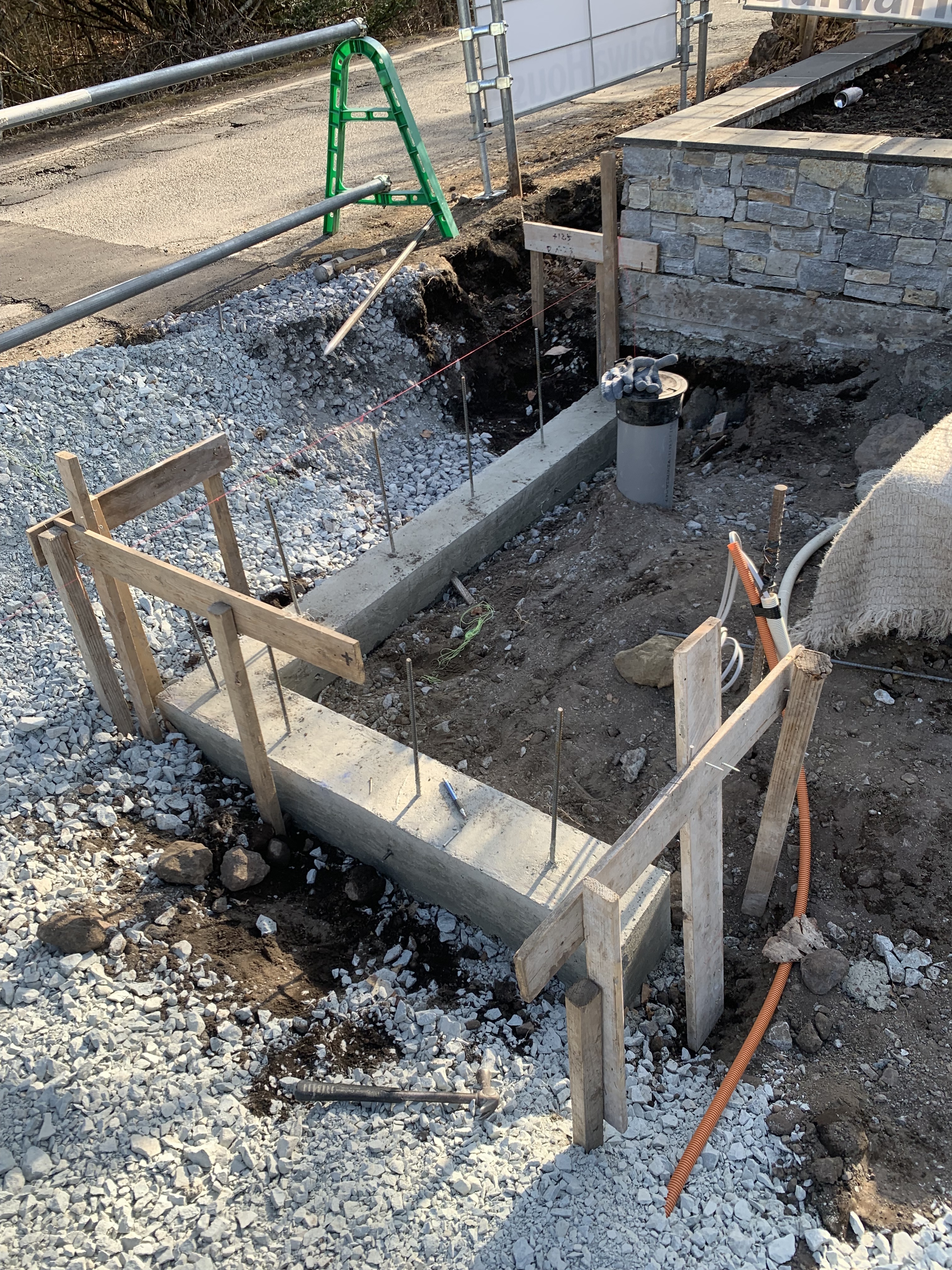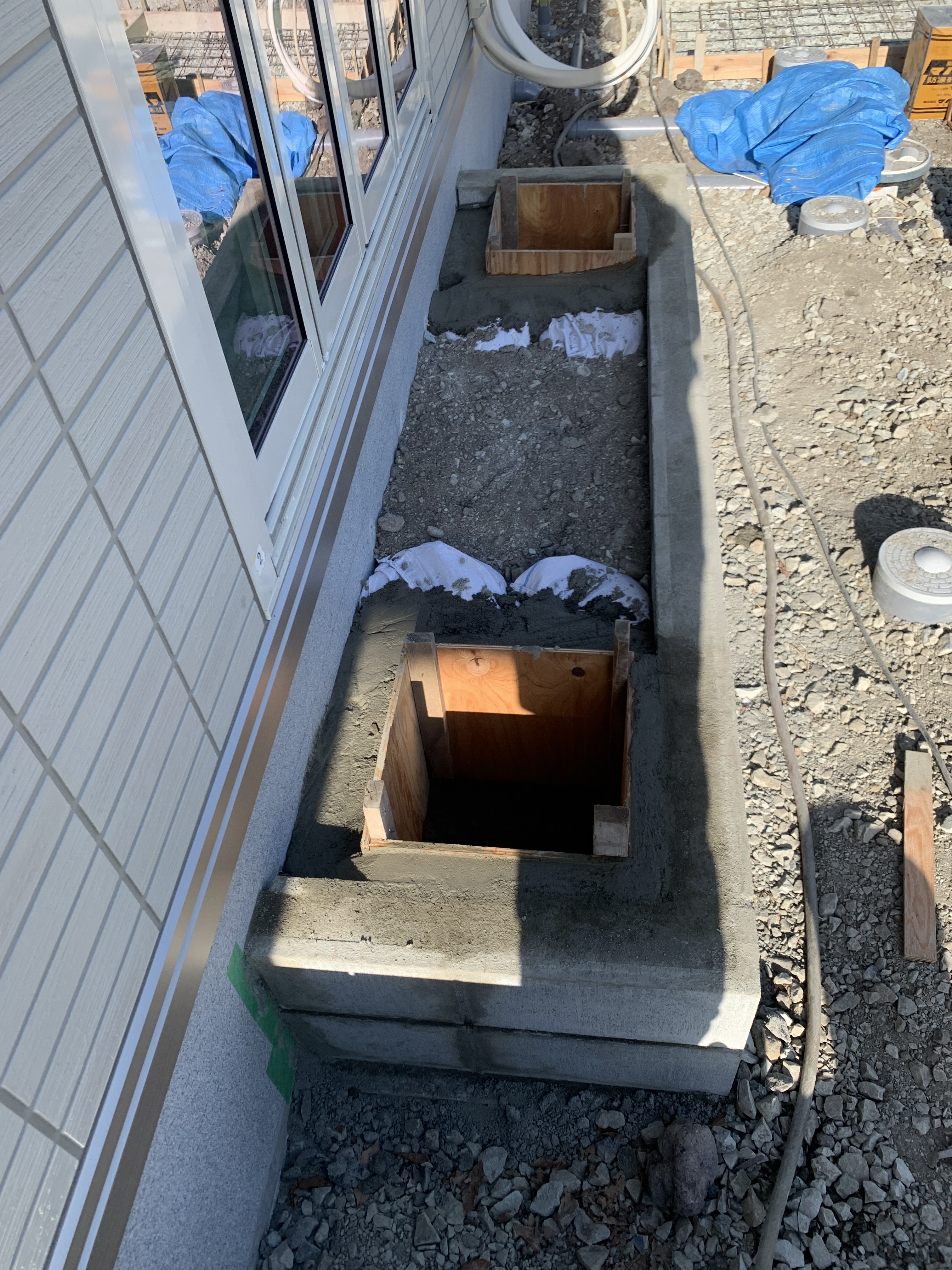 シートはぎ、ブロック積み型枠バラシ、オーニング基礎型枠設置、モルタル打設、ブロック積み丁張り出し、ブロック積み(1段)、養生