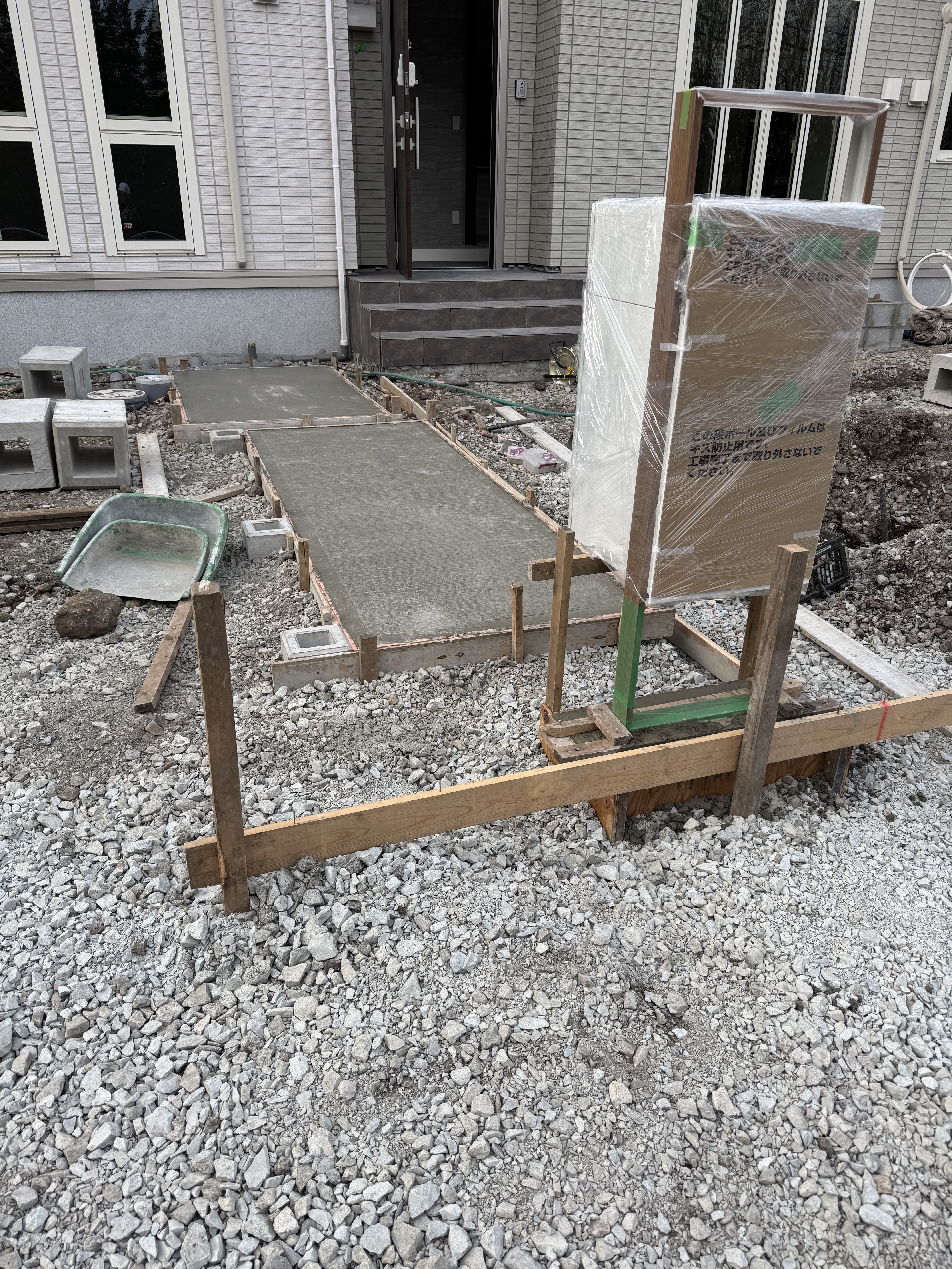 7時から18時20分、DHS様邸、丁張り掛け、生コン打設、1.5m3プラス0.4m3、掘削、残土運搬4台、束石大布設、アプローチの型枠組み立て、