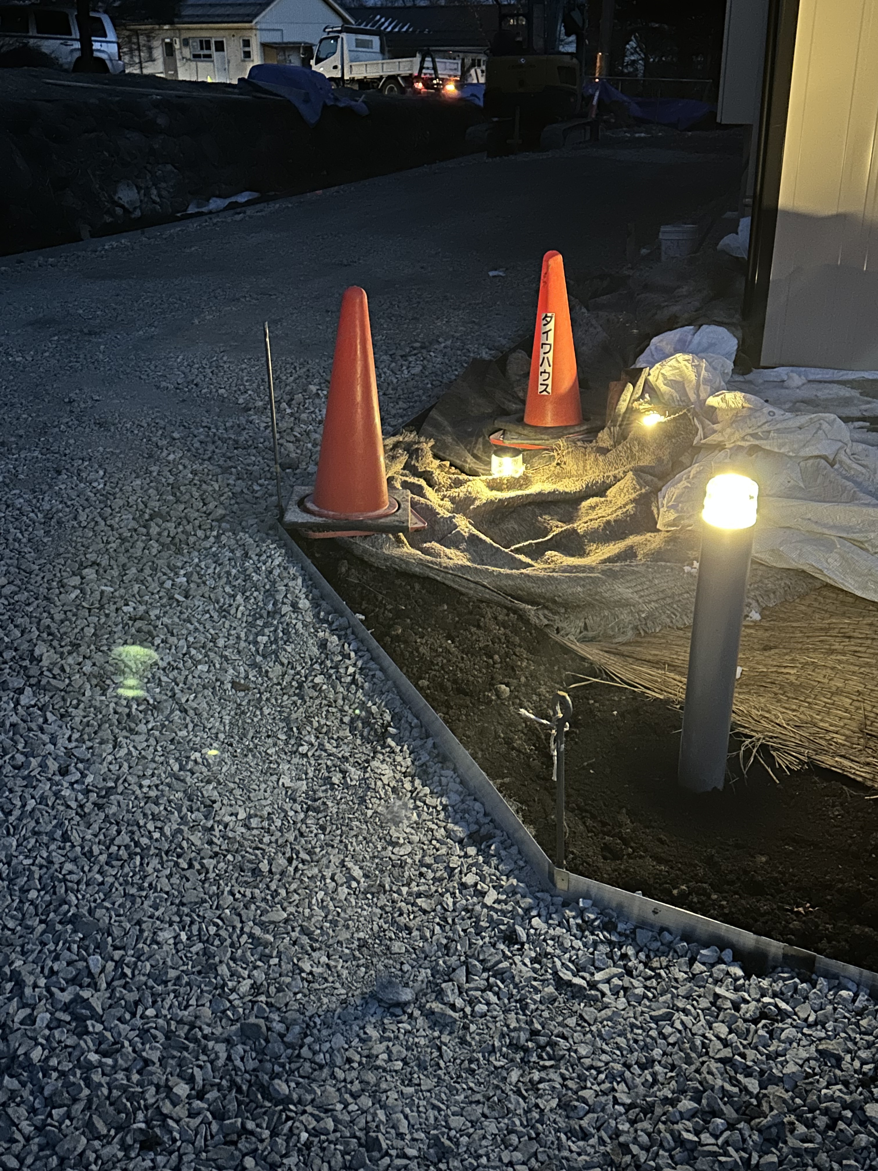 シート剥ぎ アルミ見切り材設置 駐車場輪止め墨出し 型枠生コン打設補 輪止めの場所と枕木擬木の場所のシート養生。