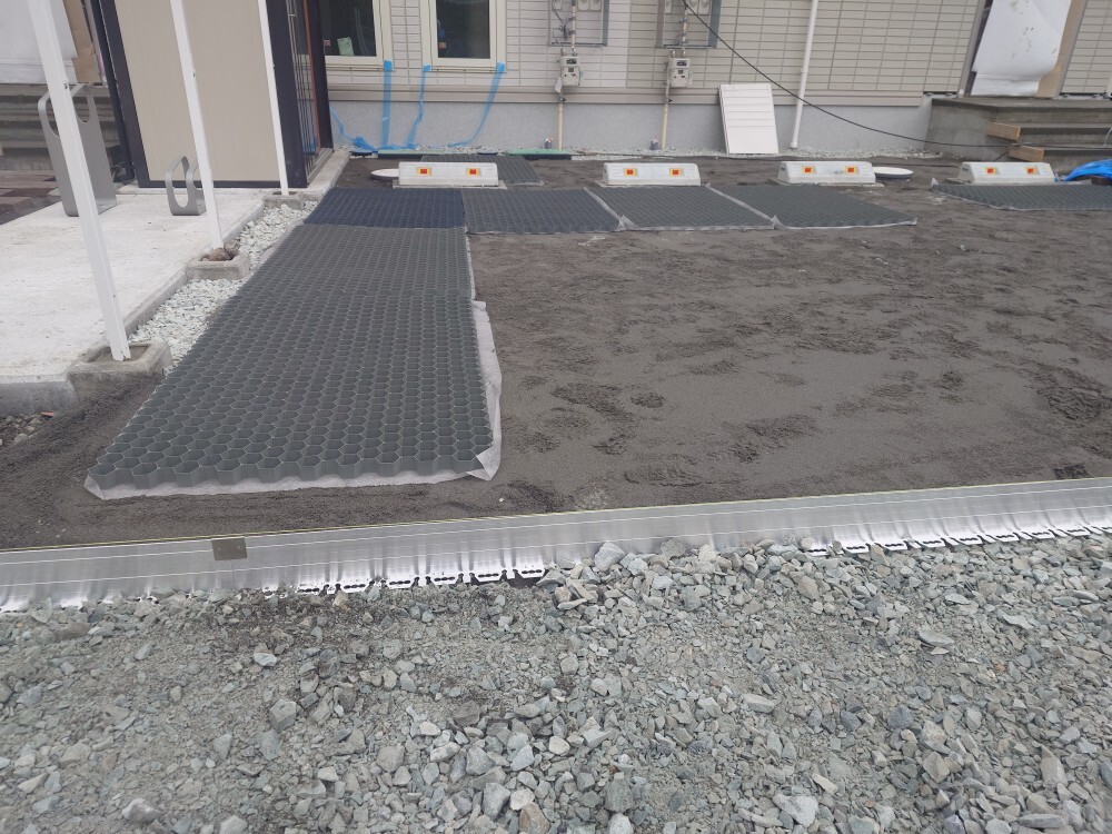 駐車場工事、砕石敷き均し、転圧、洗砂敷き均し、転圧