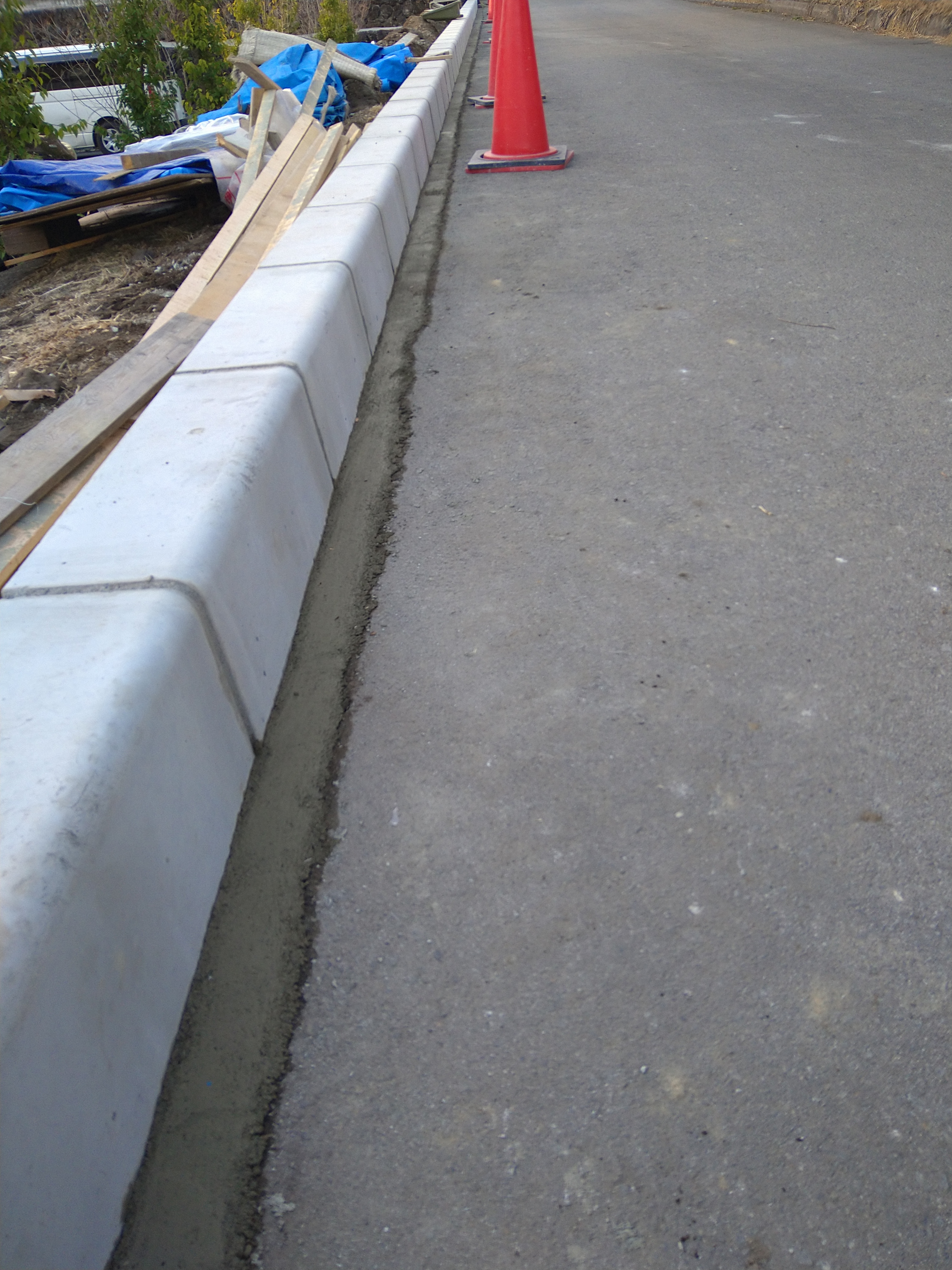 朝礼後に歩車道ブロックのベースの型枠バラしをしていたら、バークチップが必要との事で、在庫確認してもらい100袋持ちに行って来ました!11時過ぎに戻って来たので、歩車道ブロックの道路との隙間に砕石を3㌢下がりで一輪車を使って入れ、ハンマーで転圧しました!