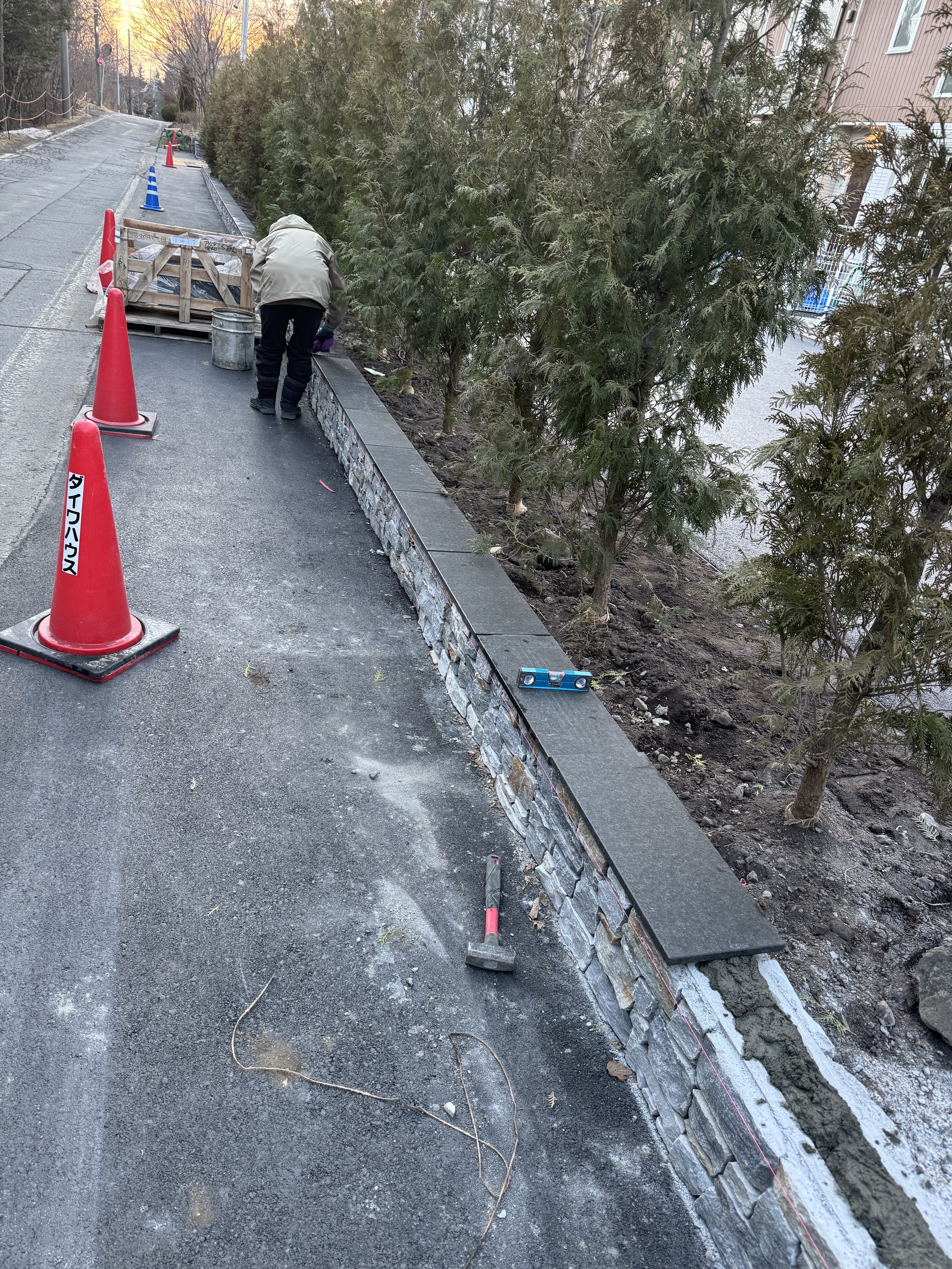 7時から19時、DHS様邸、地先境界ブロックの掘削、布設、5mを2ヶ所、石張り、ブロックの笠木布設約40m、歩車道境界ブロックの道路側のモルタル打設、目地、ポストの仕上げ、植木引き取り、片付け
