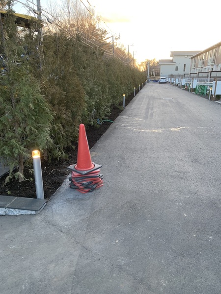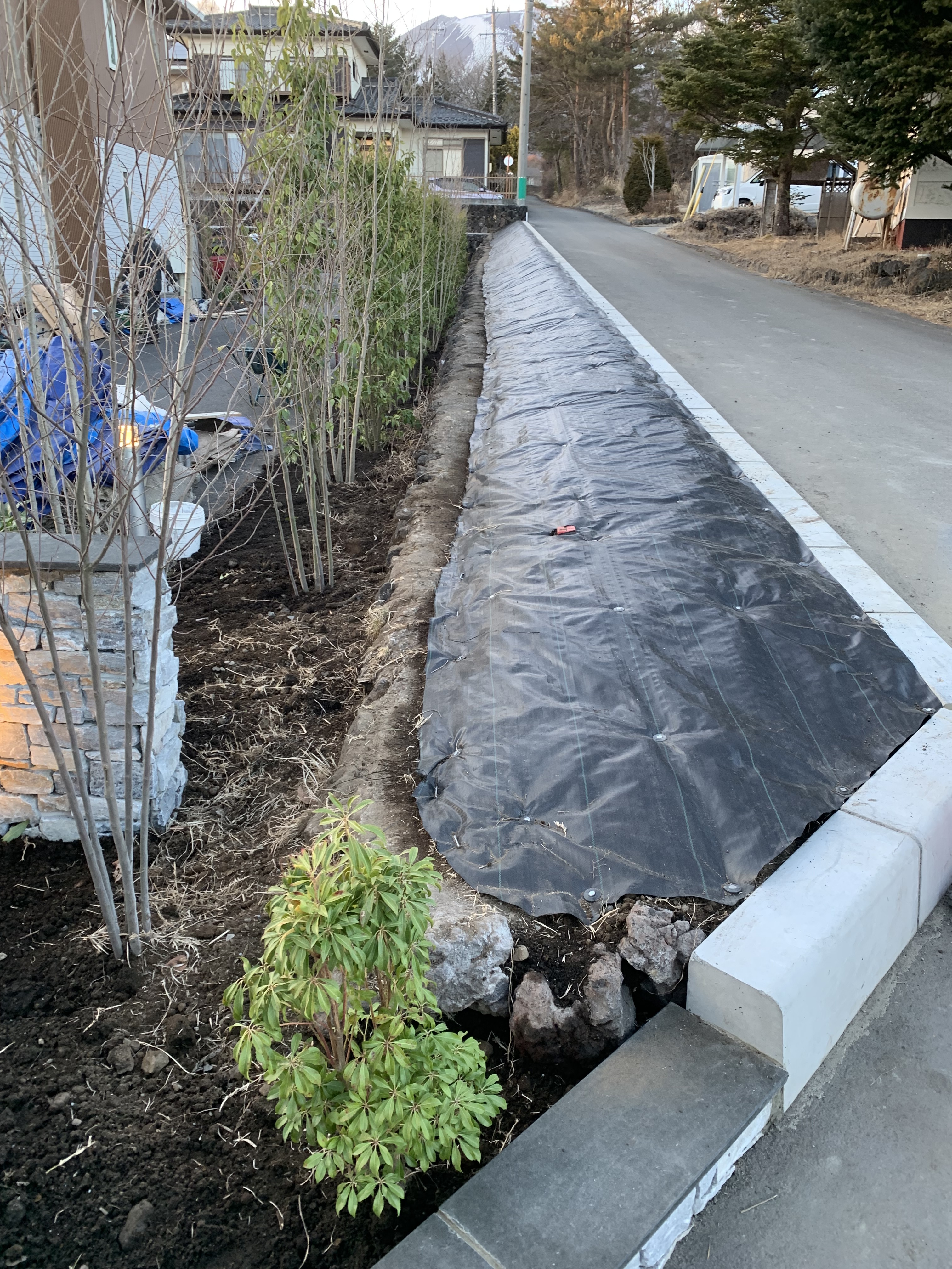 シートはぎ、看板設置、ブロック笠設置、黒土入れ、土派打ち、資材を置き場へ運搬、ユンボ置き場へ回送
