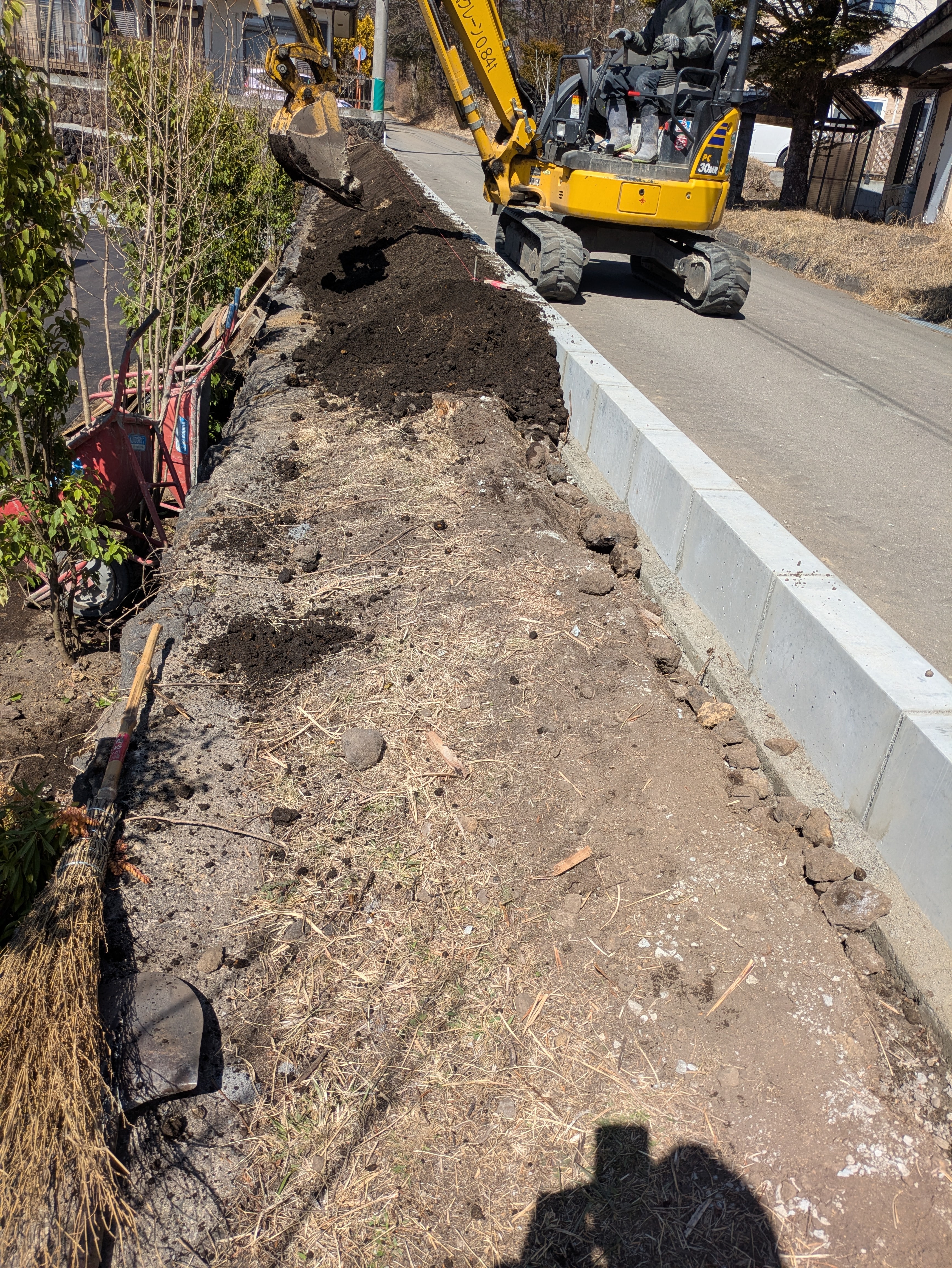 歩車道ブロック裏の埋め戻し、法面整形