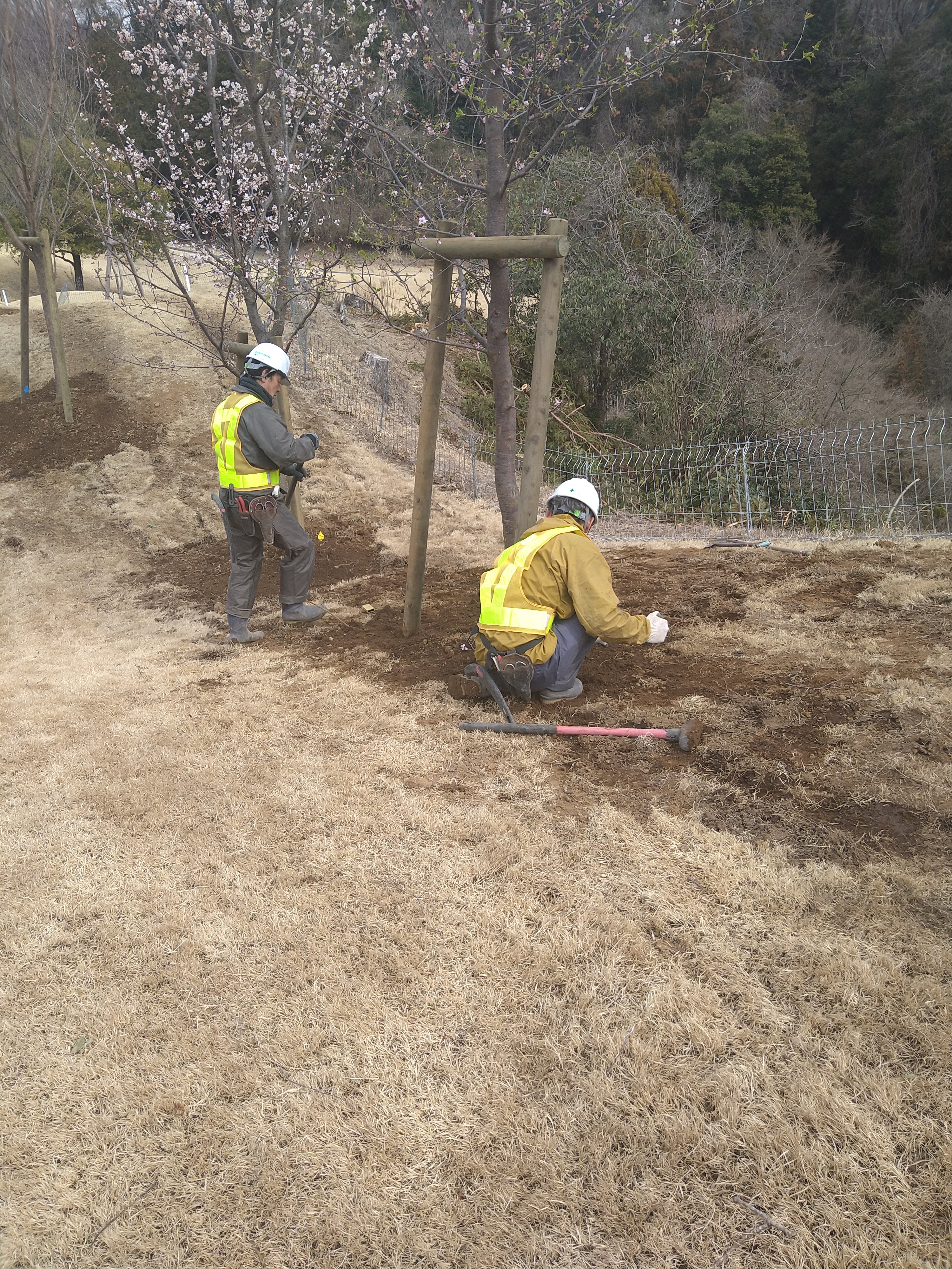 県外の現場だったので早めに出発しましたが、道を間違えて8時10分に現場に着きました!手分け作業で、3名で、植栽してあった桜や梅20本に支柱を打ち込んだり、埋め込んだりし、木の周りだけ整地をしました!午後から、支柱を針金で縛りました!