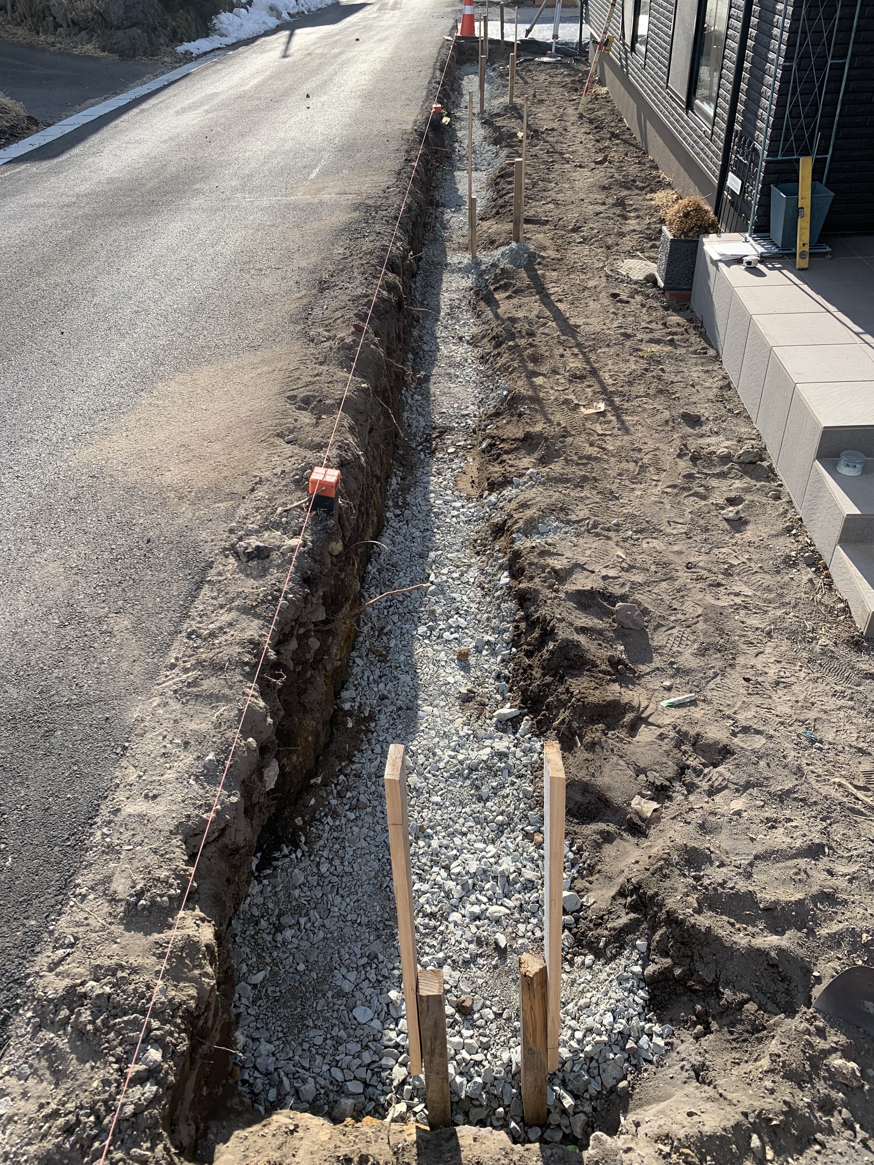 道路養生、位置出し、掘削(残土2台会社へ運搬)、砕石入れ(2.5立米)、転圧、丁張り出し、養生