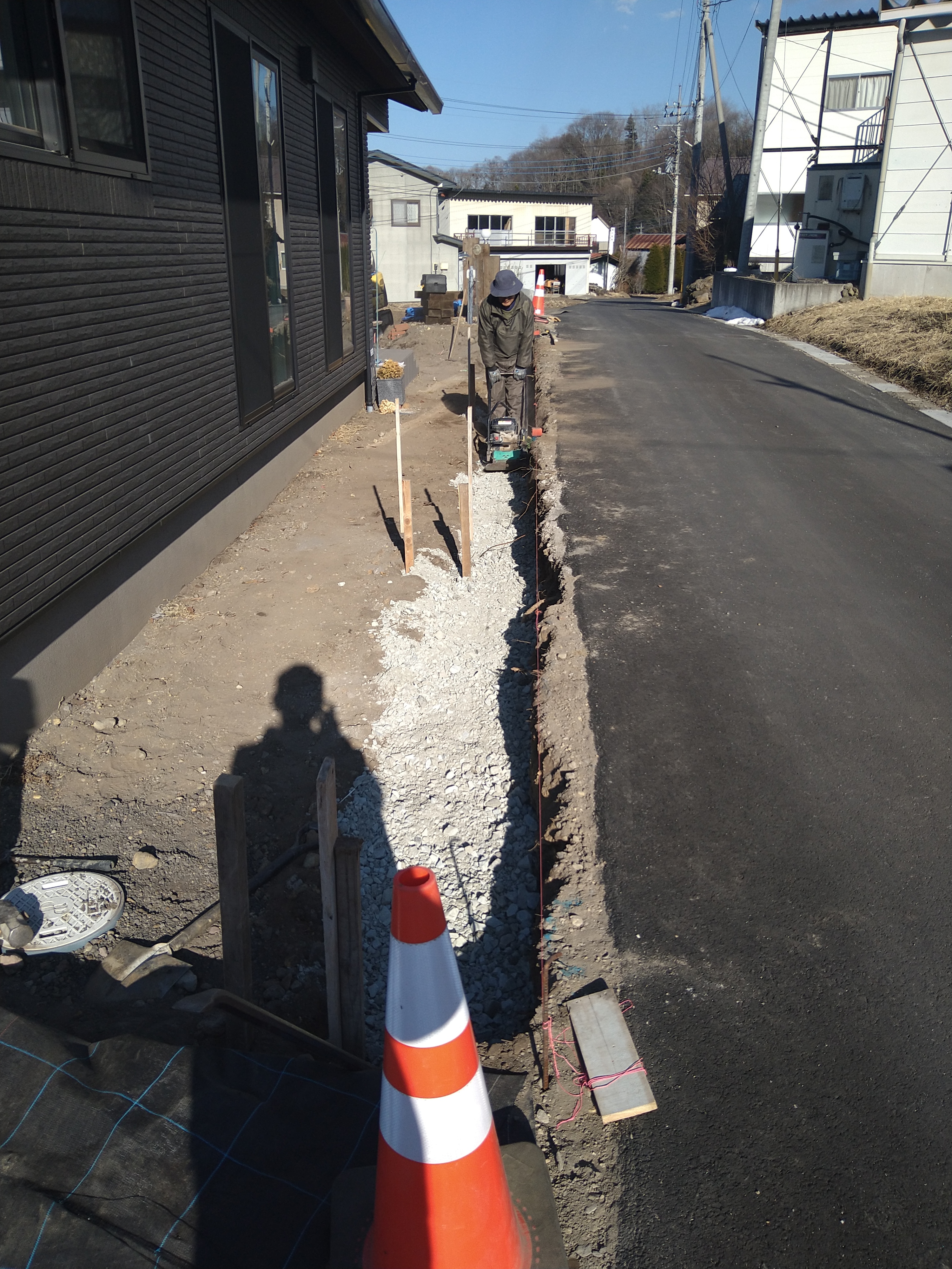 床付け後に砕石を持ちに行き砕石を、ダンプからユンボですくい、一輪車で小運搬して砕石搬入し転圧をしました!明日使う鉄筋の段取りをしました!ダンプ2台、ユンボ、ミニユンボ、プレート、レーザー使用で人員2名、5時終了しました!