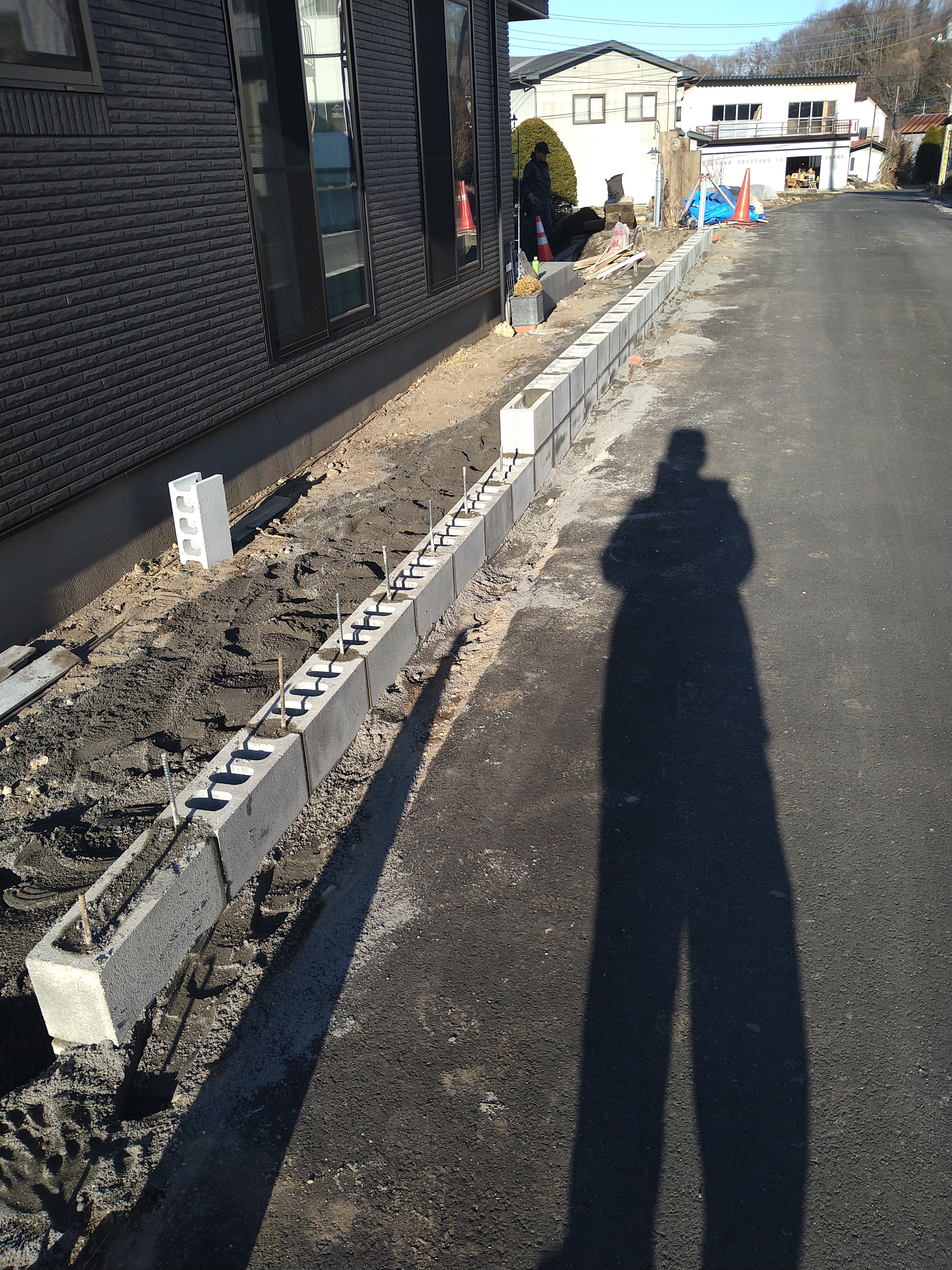 7時40分より養生シートを剥ぎ、フェンス支柱が1㍍ピッチになるかもとの事なので、鉄筋の割りふりをやり直して、無い箇所にはハンマードリルで穴を空け、鉄筋を差して配筋しました!ちょうど雨も上がったので、1段目のブロックを配り、モルタル練り、ブロックにモルタル入れ、目地をし、2段目、3段目もそのパターンでやりました!