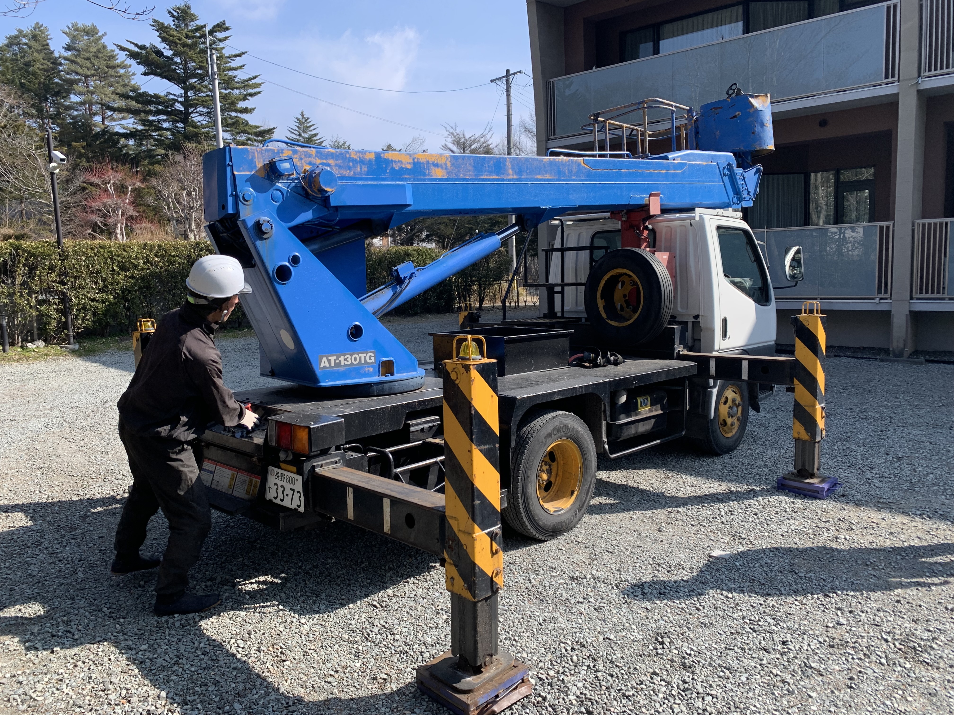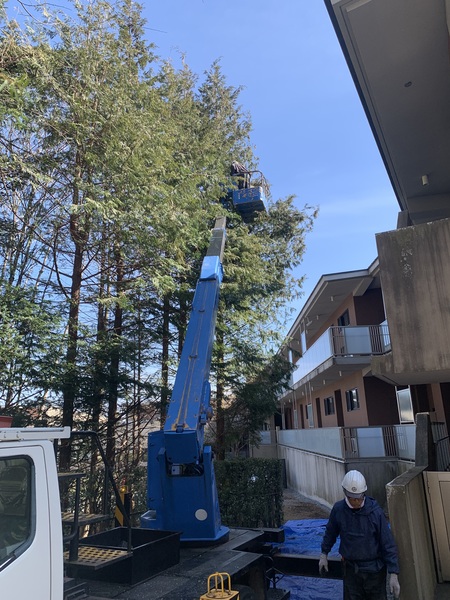高所作業車による隣地に伸びた枝の伐採(枝払い、伐採2本)、刈り込み(サワラ)、片付け(場内処理)、掃除、道具引き上げ、会社で積み下ろし