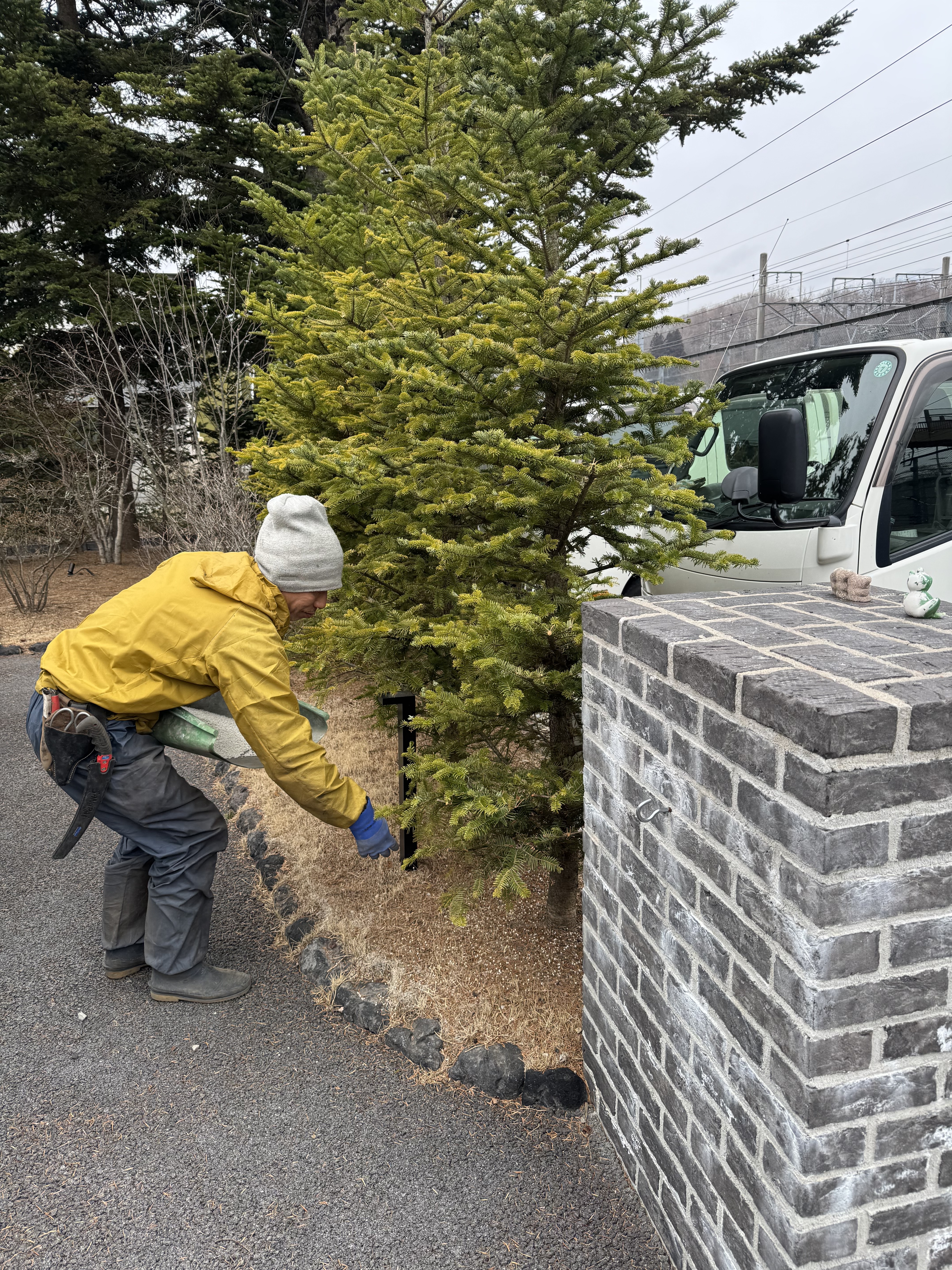 8時から10時30分、CKM3様邸、イチイ3本、モミジ4本、ドウダン3本植替え、枯木置場に運搬、人員4人、使用機械、ユニック、ダンプ