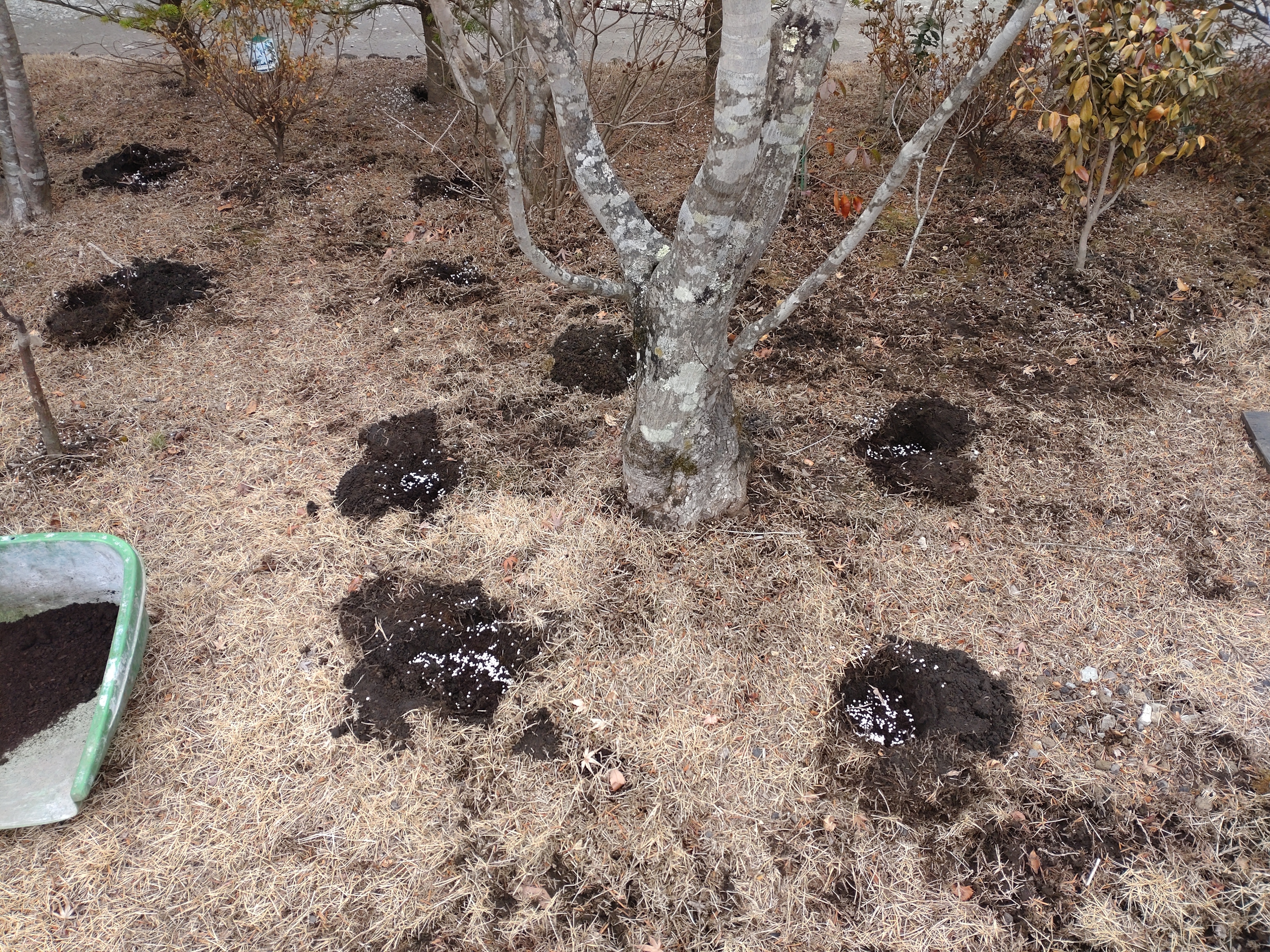 植木牛糞、肥料やり(各植木のまわりに数カ所あなを掘り牛糞肥料、