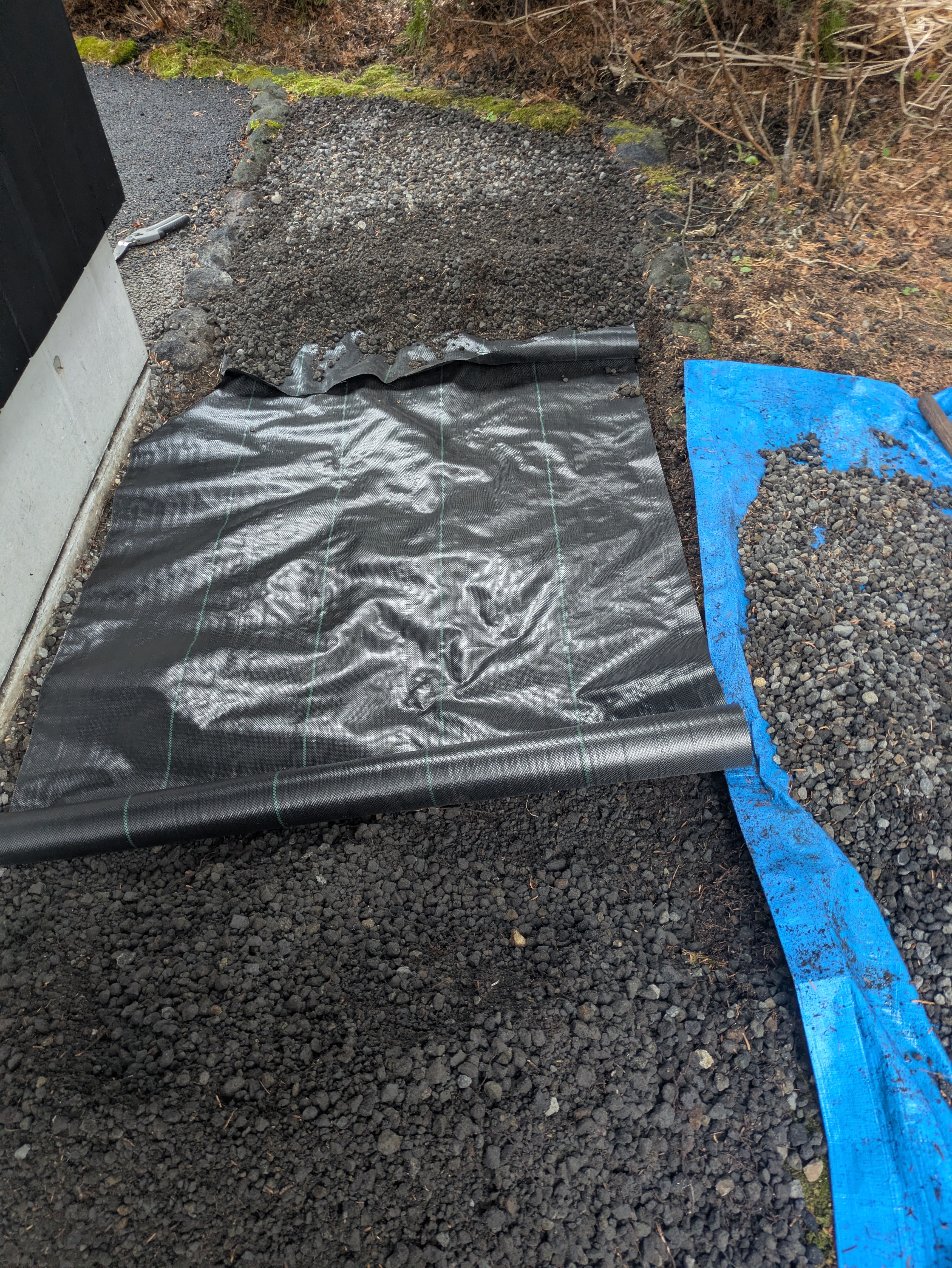 1度ビリを、土表面まで剥がして、防草シートを敷きビリを戻す作業