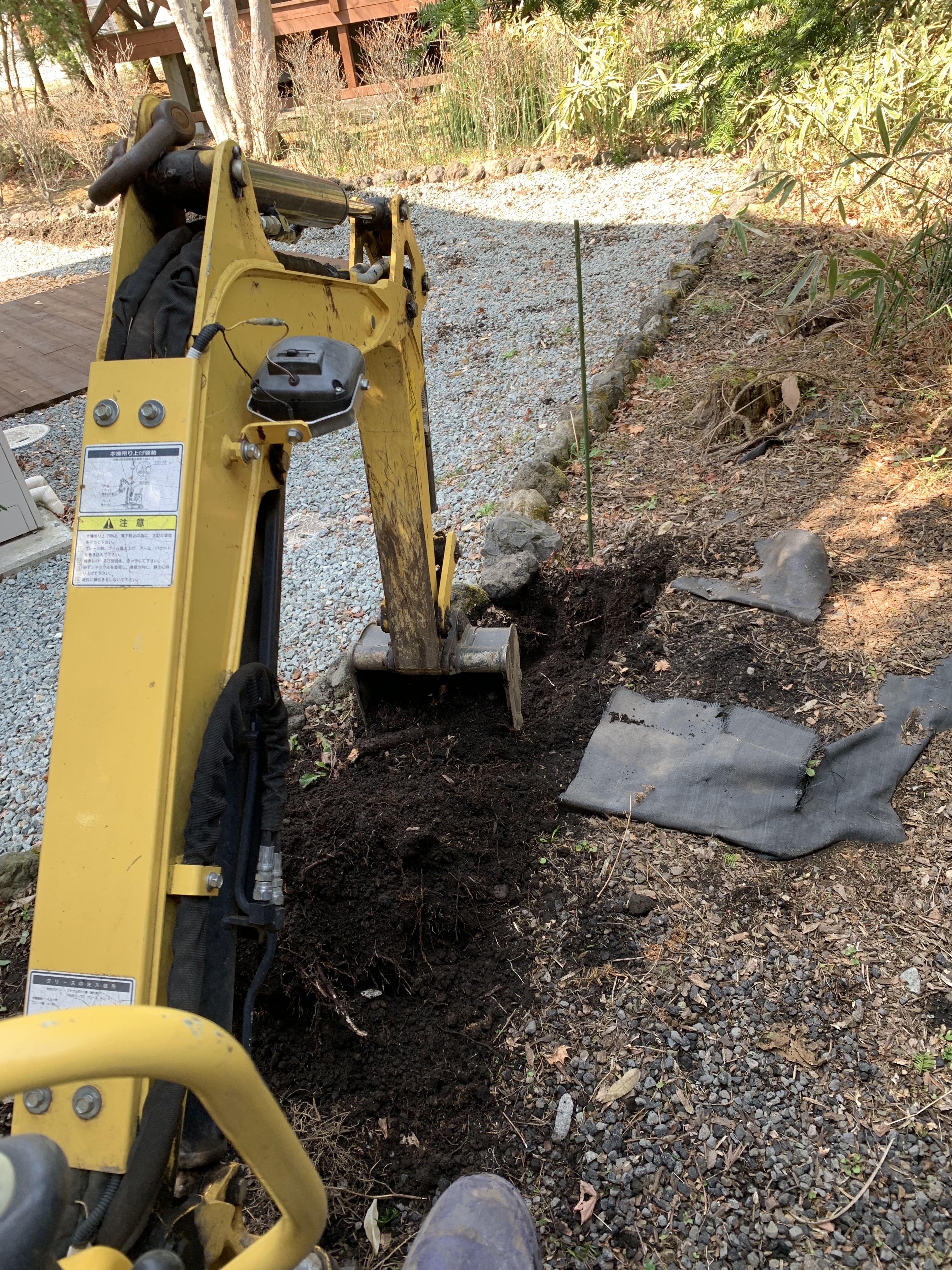 置き場からミニユンボ運搬、石積み掘削、置き場から砕石約1立米積み込み運搬、砕石入れ、転圧