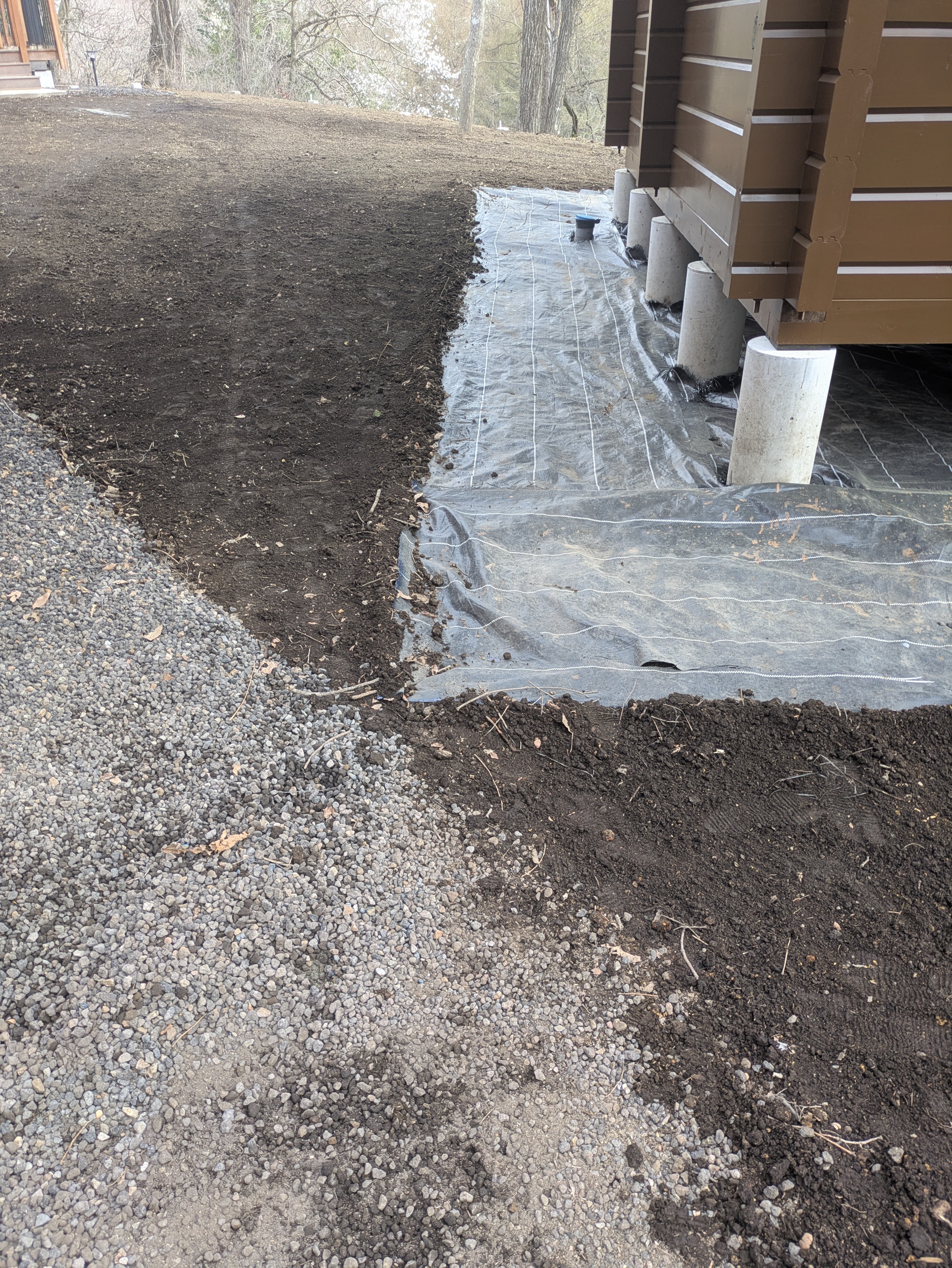 サウナ、デッキ周りの防草シートの加工、敷き詰め