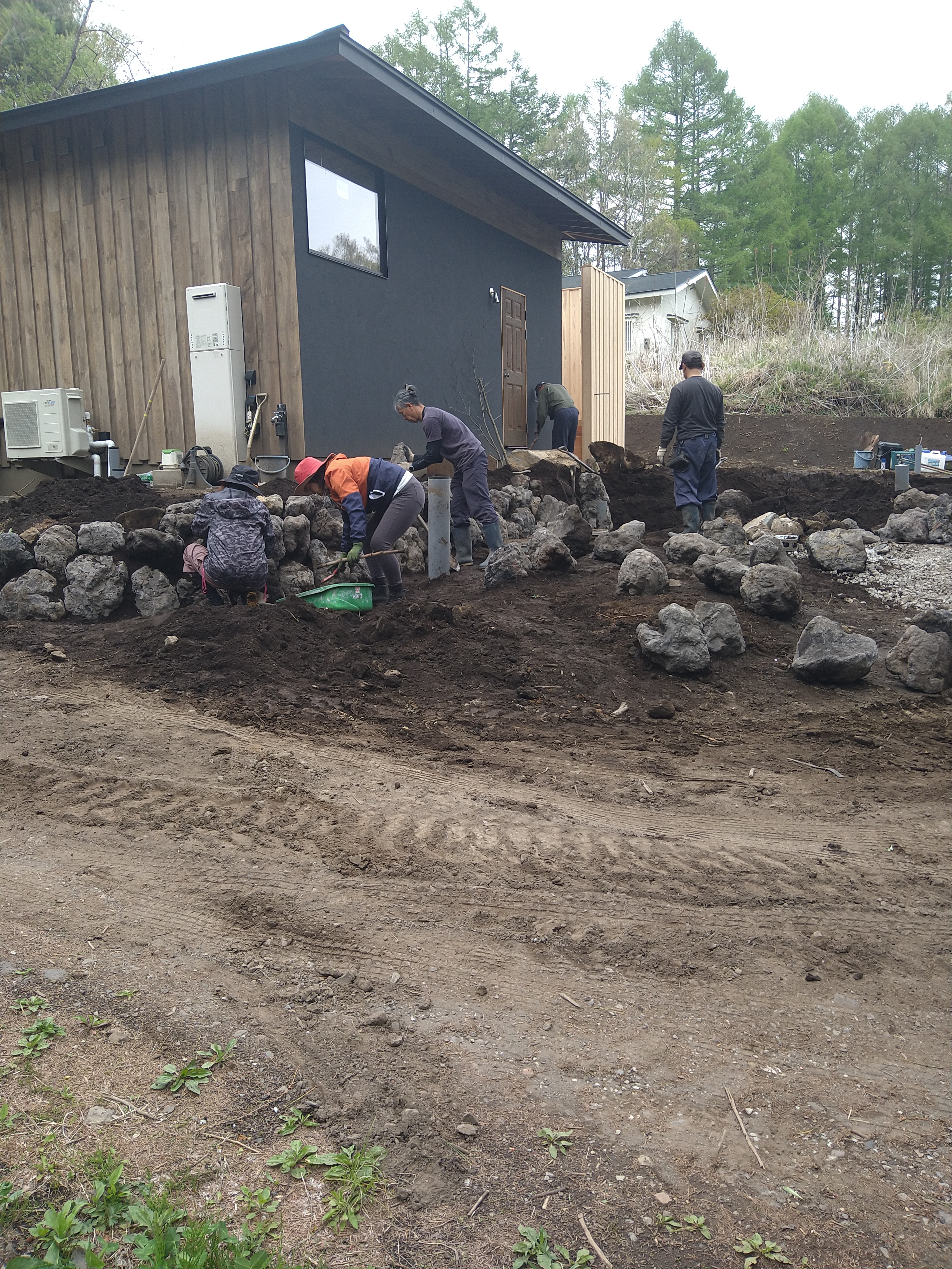 朝、DHS様邸現場へ、会社から積んで行ったインパクト、杉皮等を下ろしてH圃場よりユンボを積みに行きました!戻ってヒバに布掛け支柱付けの補助をしました!インパクト使用、人員3名で10時半に移動してYSO様邸現場へ行き、ユンボを下ろしてH圃場に行き、ハサミを石ストックヤードに運搬し、浅間石400~600をトータル2台運搬しました!